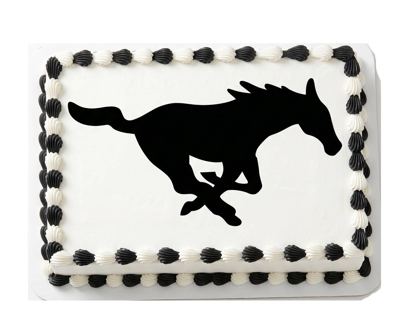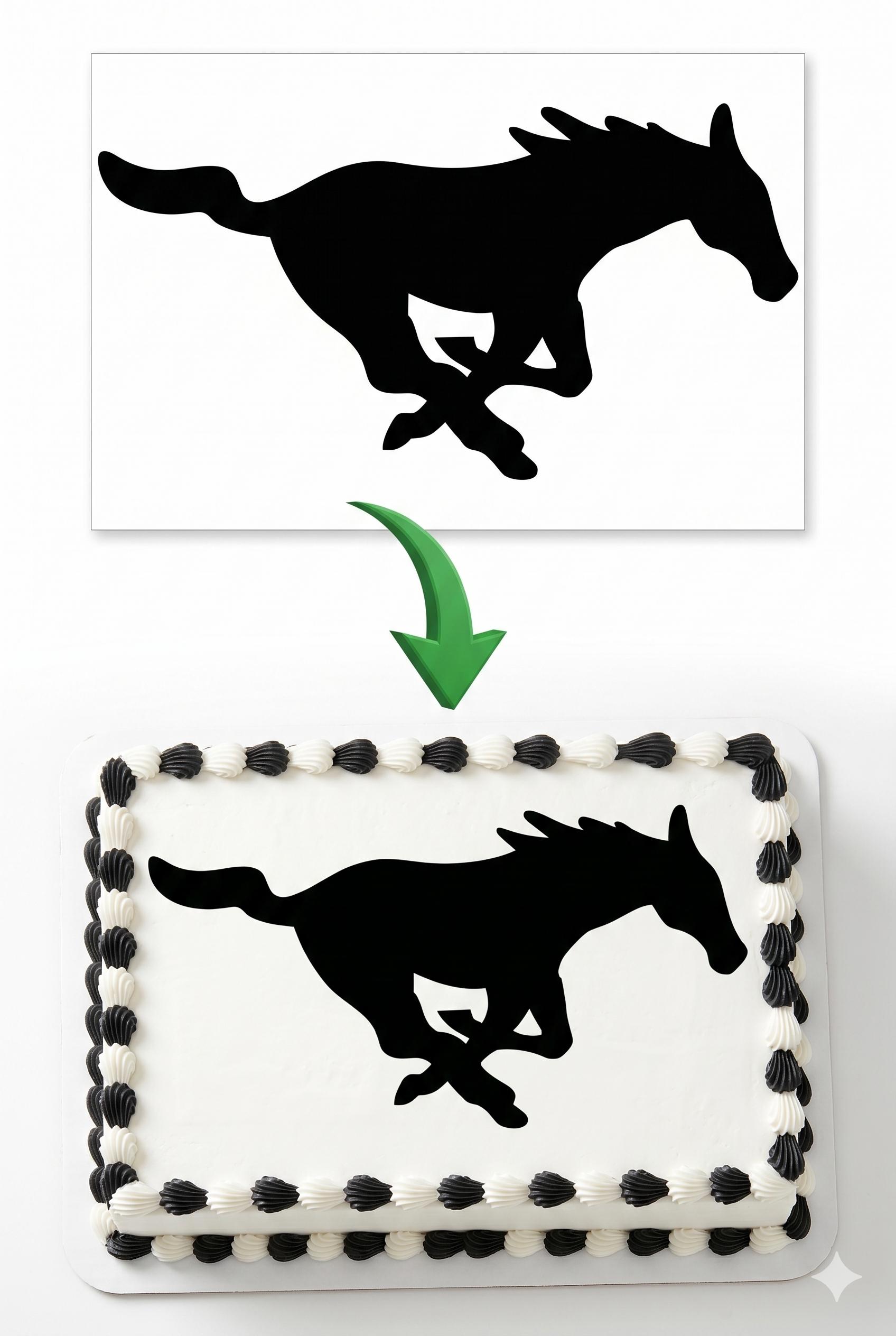 Mustang Mascot Edible Cake Topper — Bold Black Running Horse Silhouette Frosting Sheet Image Printed on Premium Fondant Sheet. Free Custom Text!