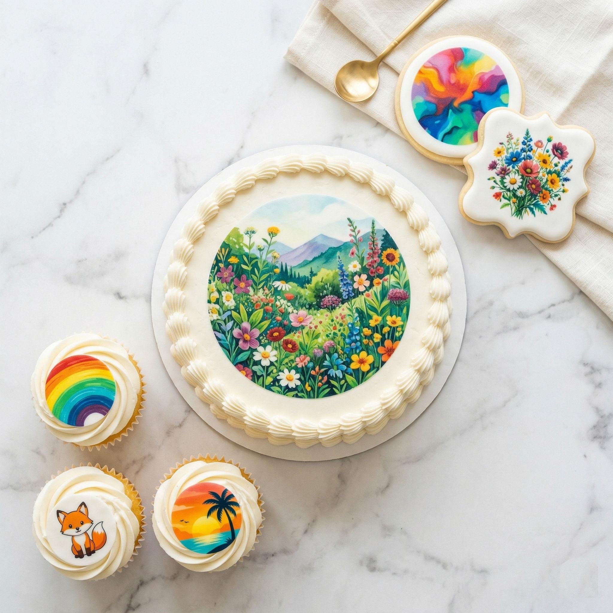 Peel the edible image from the backing sheet and place it on your freshly frosted cake, cupcakes, or cookies. For best results, apply to a smooth layer of buttercream or fondant icing. The edible sheet will blend into your frosting within hours for a seamless, professional finish.