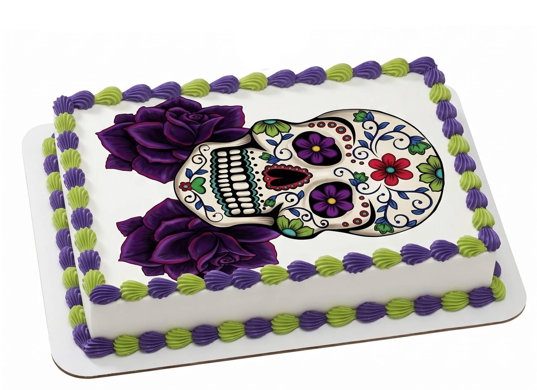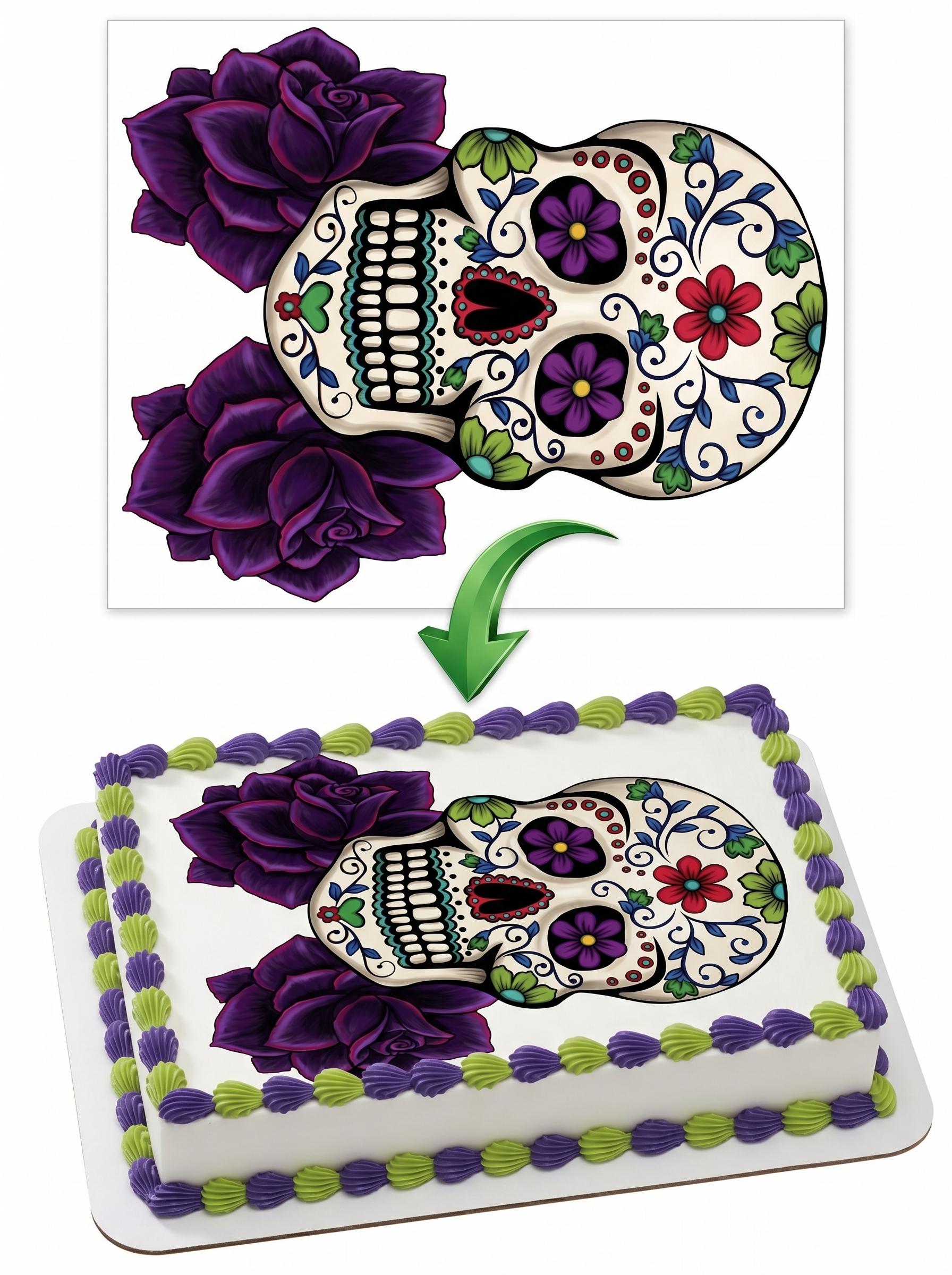 Our edible cake toppers arrive printed exactly as pictured on a premium fondant frosting sheet (cake not included). A beautifully detailed sugar skull adorned with swirling florals, purple roses, and vivid jewel-toned flowers captures the bold, artistic spirit of Dia de los Muertos — perfect for Day of the Dead celebrations, Halloween parties, gothic birthdays, and anyone who loves colorful skull art. Simply trim to size, peel from the backing, and place on your frosted cake for a stunning, professional finish. Made to order with vibrant, food-safe edible ink on a high-quality icing sheet that blends seamlessly into buttercream, fondant, royal icing, or whipped frosting.