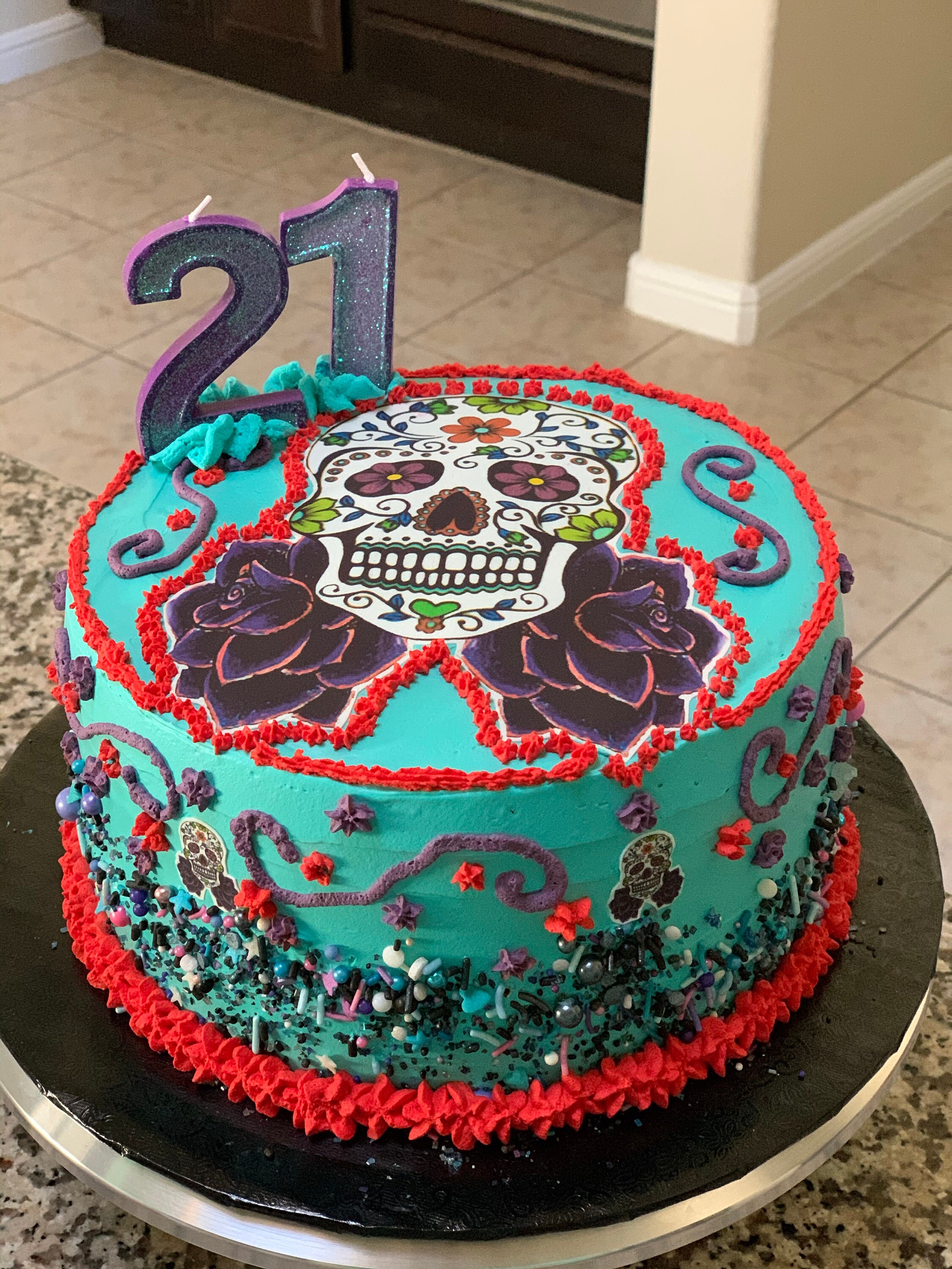 Sugar Skull and Purple Roses Birthday ~ Edible 2D Fondant Birthday Cake/Cupcake Topper ~ D22438