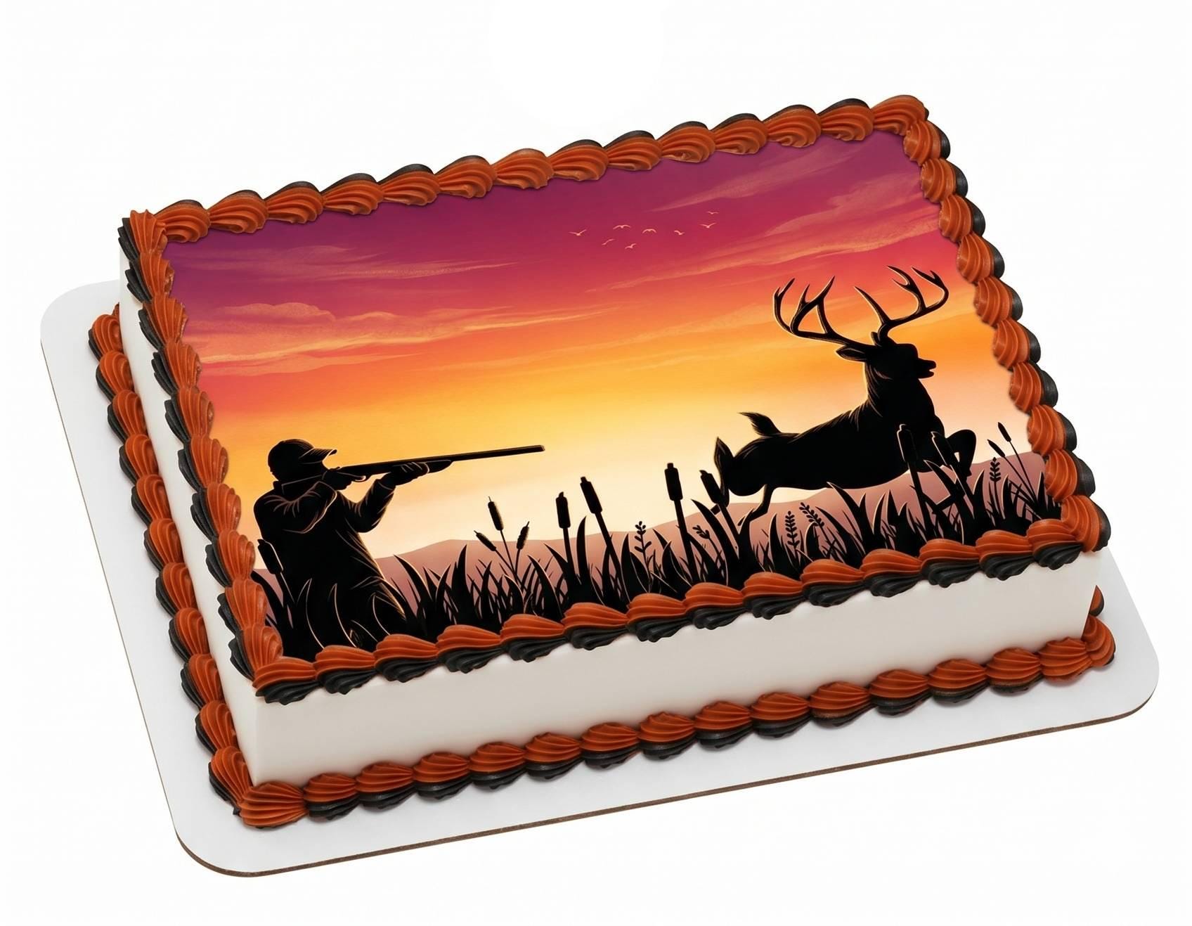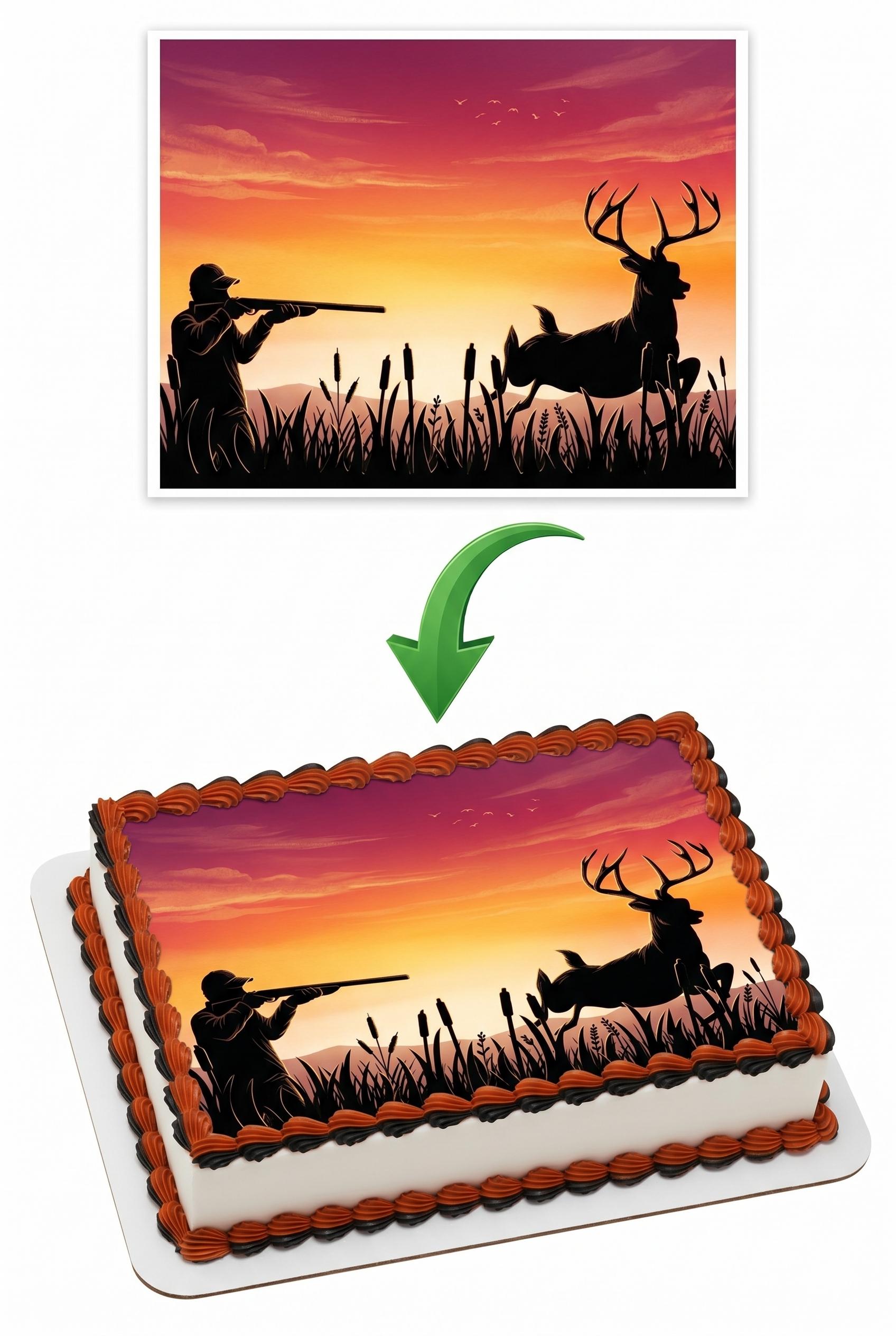 Deer Hunting Sunset Edible Cake Topper — Hunter and Leaping Buck Silhouette Sunset Frosting Sheet Image Printed on Premium Fondant Sheet. Free Custom Text!