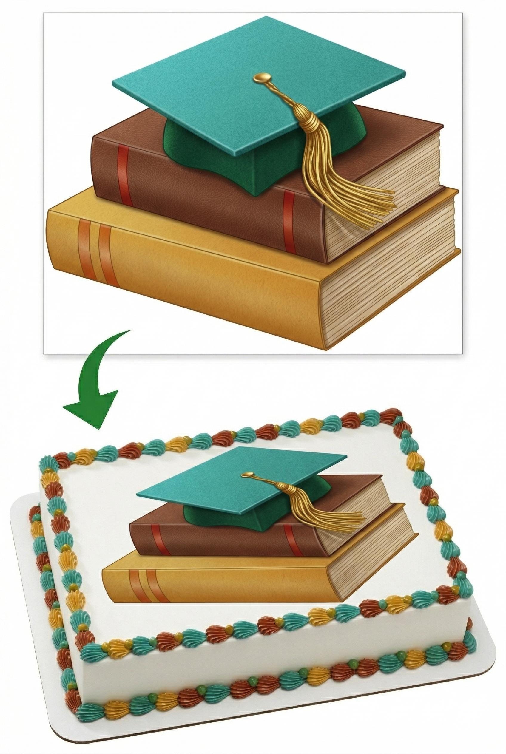 Your edible graduation cap books cake topper arrives printed exactly as pictured on a premium fondant frosting sheet (cake not included). Featuring a teal graduation cap with a gold tassel resting on stacked books beside a rolled diploma — this elegant academic design symbolizes hard work, learning, and achievement while adding a rich school-color touch to any graduation dessert. Simply peel, trim, and place on any frosted dessert — it's that easy. Each edible image is made to order and printed with vibrant, food-safe edible ink on a high-quality icing sheet that blends seamlessly into buttercream, fondant, royal icing, or whipped frosting.