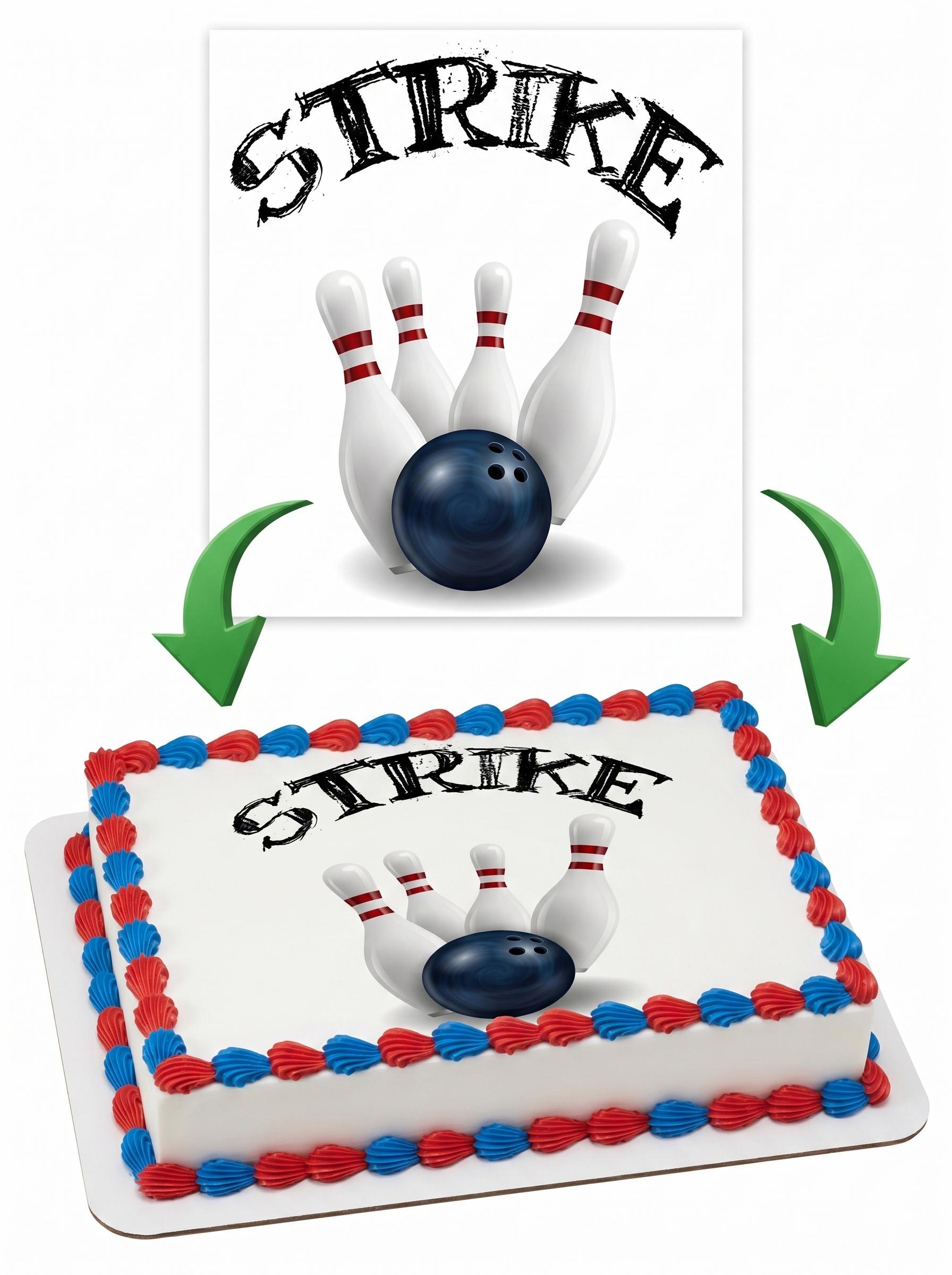 Strike Bowling Edible Cake Topper — Bowling Ball and Pins Strike Design Printed on Premium Frosting Sheet for Cakes, Cupcakes & Cookies. Perfect for Bowling Fans. Free Custom Text!