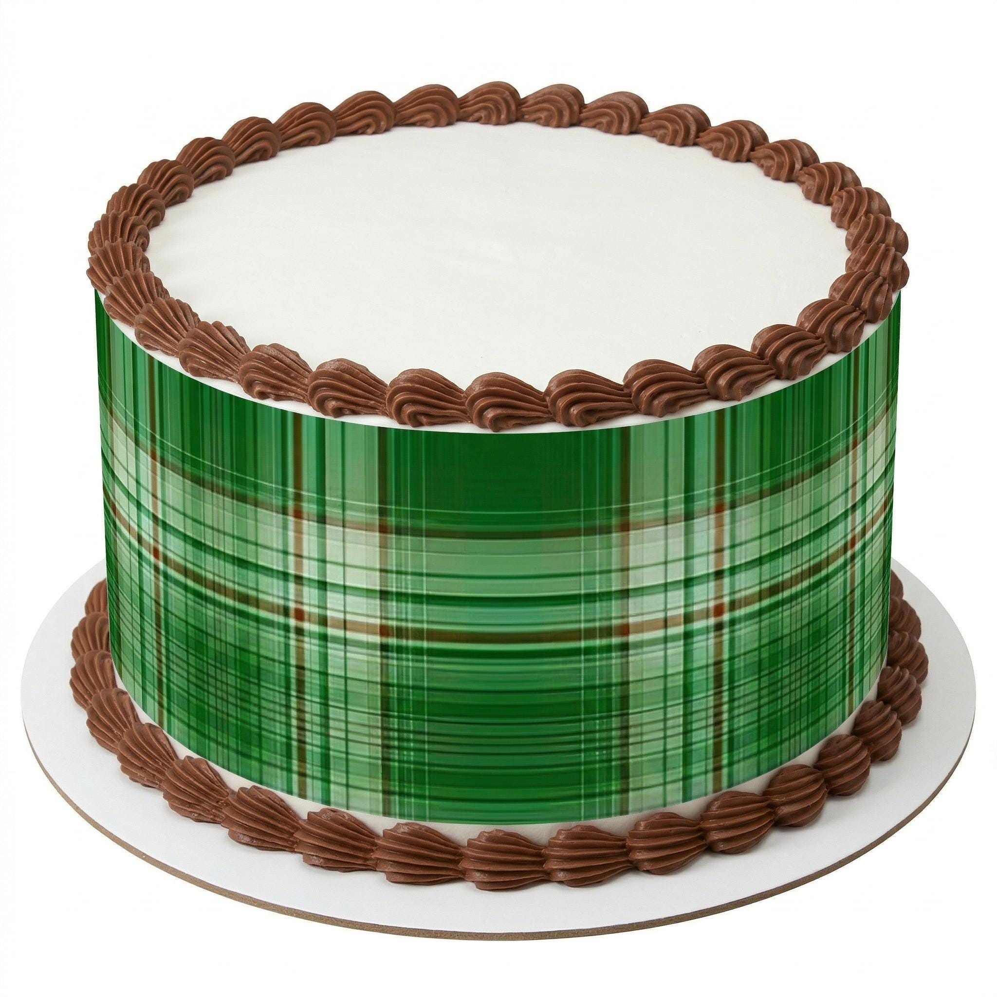 Green Plaid Edible Cake Side Strips — Classic Green and Black Tartan Pattern Printed on Premium Frosting Sheet. Wrap Your Cake for a Professional Finish. Free Custom Text!