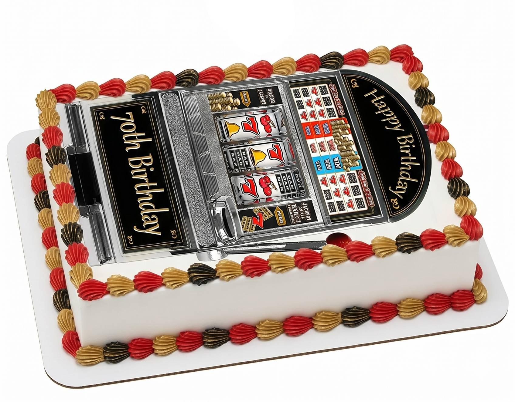 70th birthday parties, casino night themed celebrations, Las Vegas milestone birthday parties, slot machine themed events, adult milestone birthdays, surprise 70th party cakes, husband or wife turning 70, and any high-roller birthday celebration.