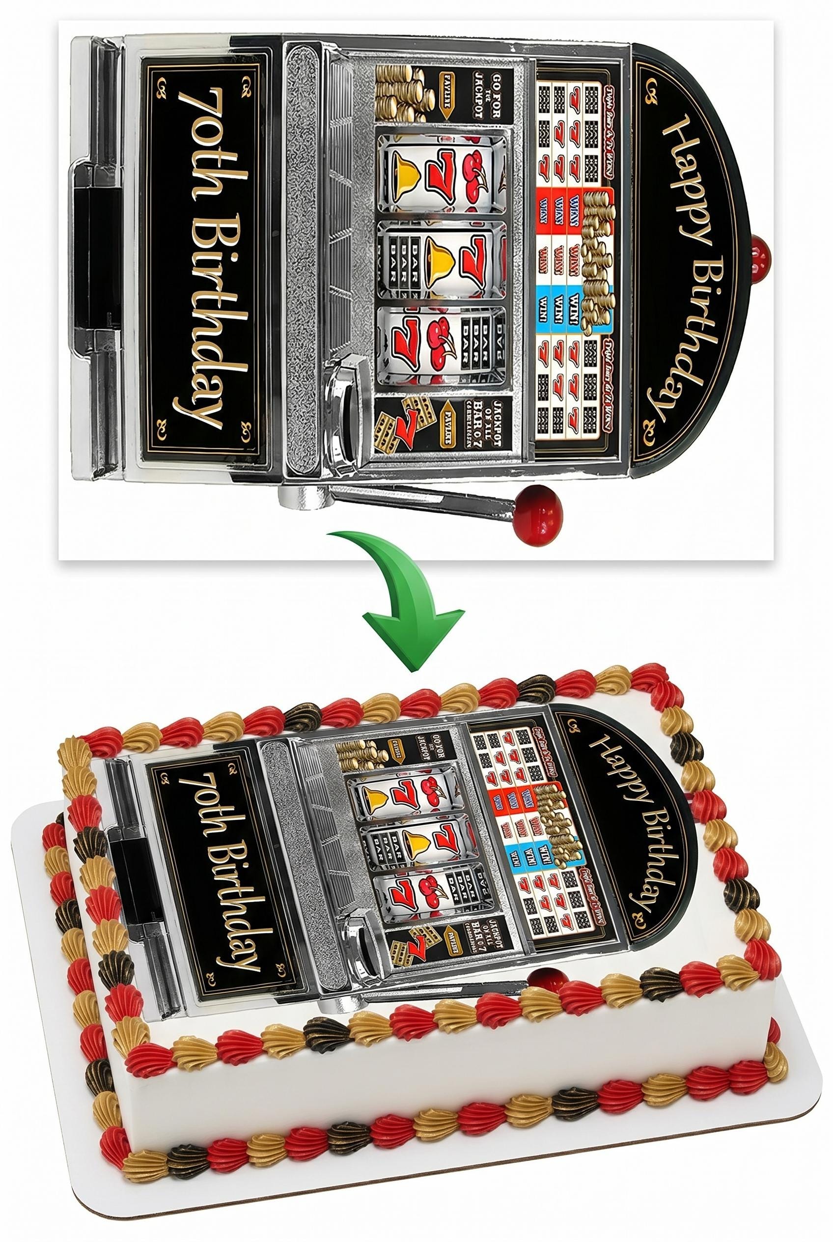 70th Birthday Slot Machine Edible Cake Topper — Casino Las Vegas Frosting Sheet Image Printed on Premium Fondant Sheet. Free Custom Text!