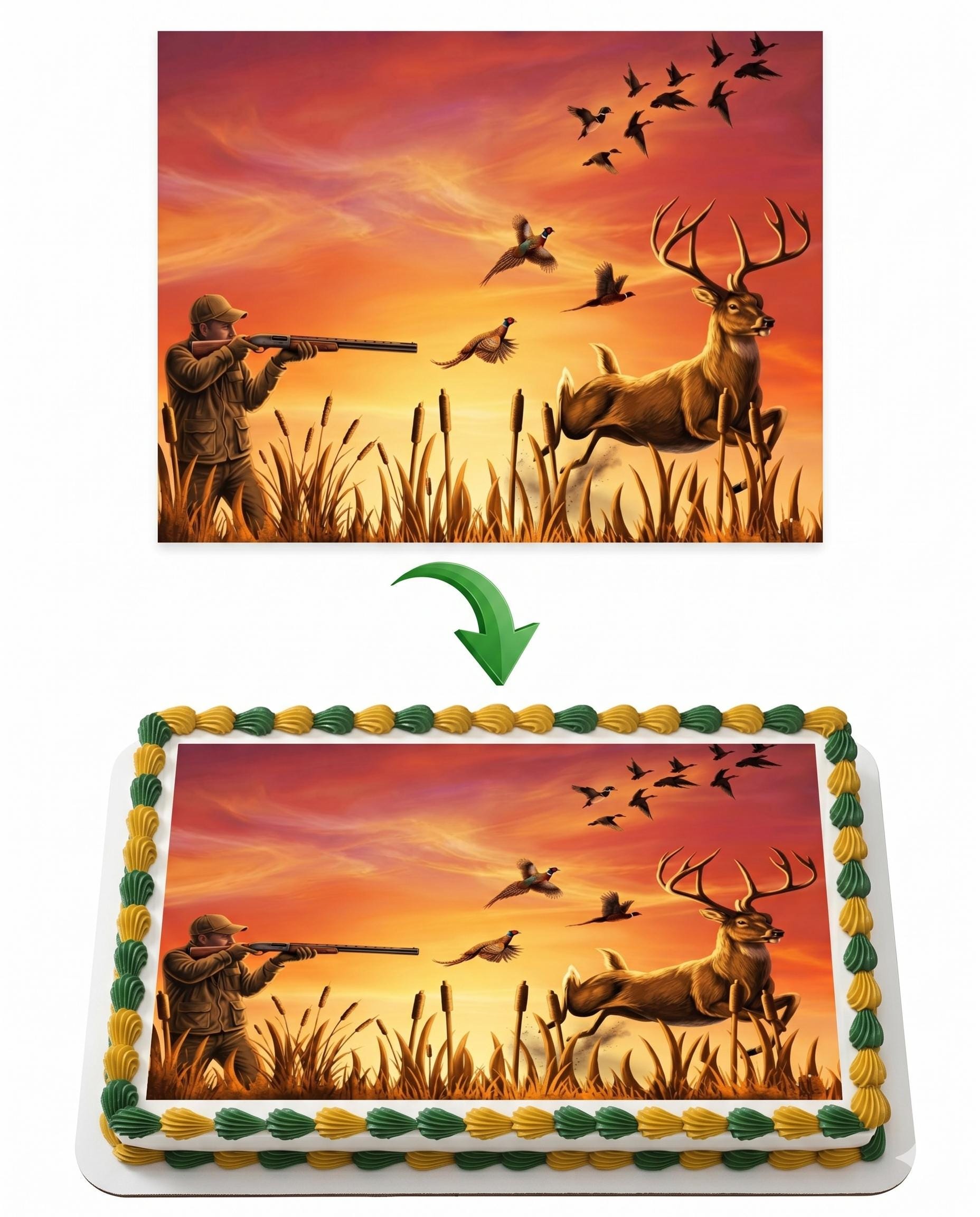 Hunting Sunset Deer Pheasant Edible Cake Topper — Outdoorsman Wildlife Scene Frosting Sheet Image Printed on Premium Fondant Sheet. Free Custom Text!