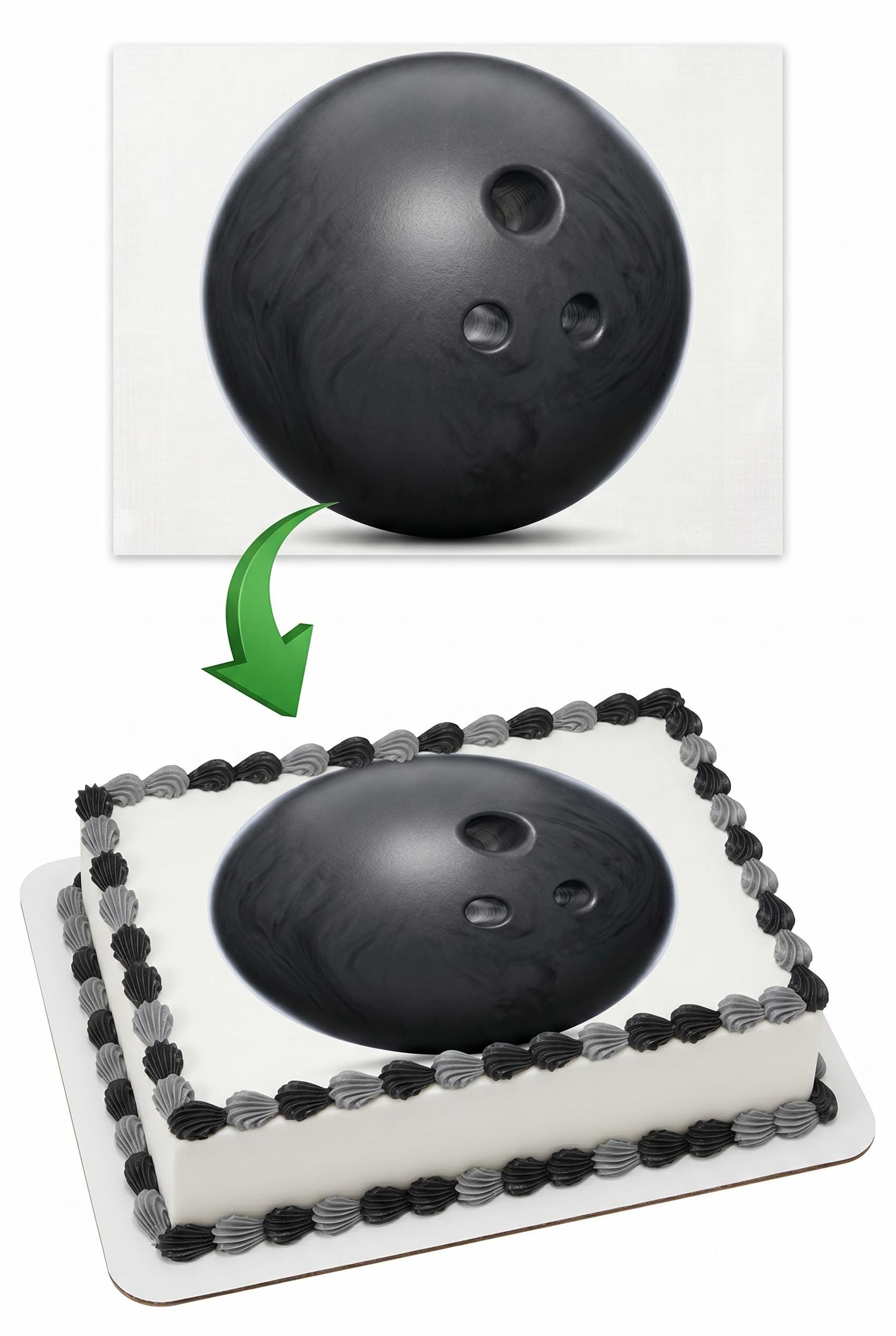 Black Bowling Ball Edible Cake Topper — Realistic Bowling Ball Design Printed on Premium Frosting Sheet for Cakes, Cupcakes & Cookies. Perfect for Bowling Fans. Free Custom Text!