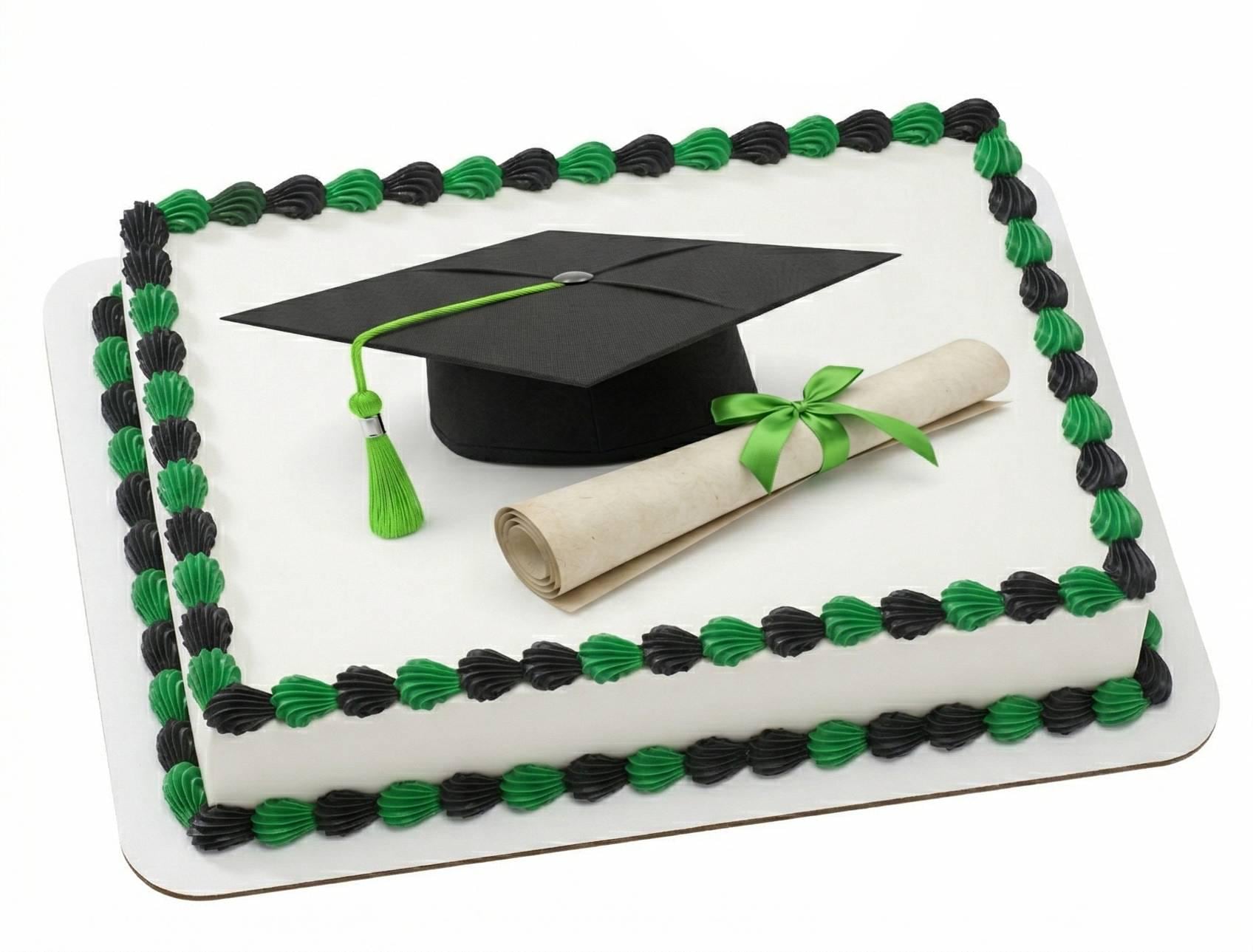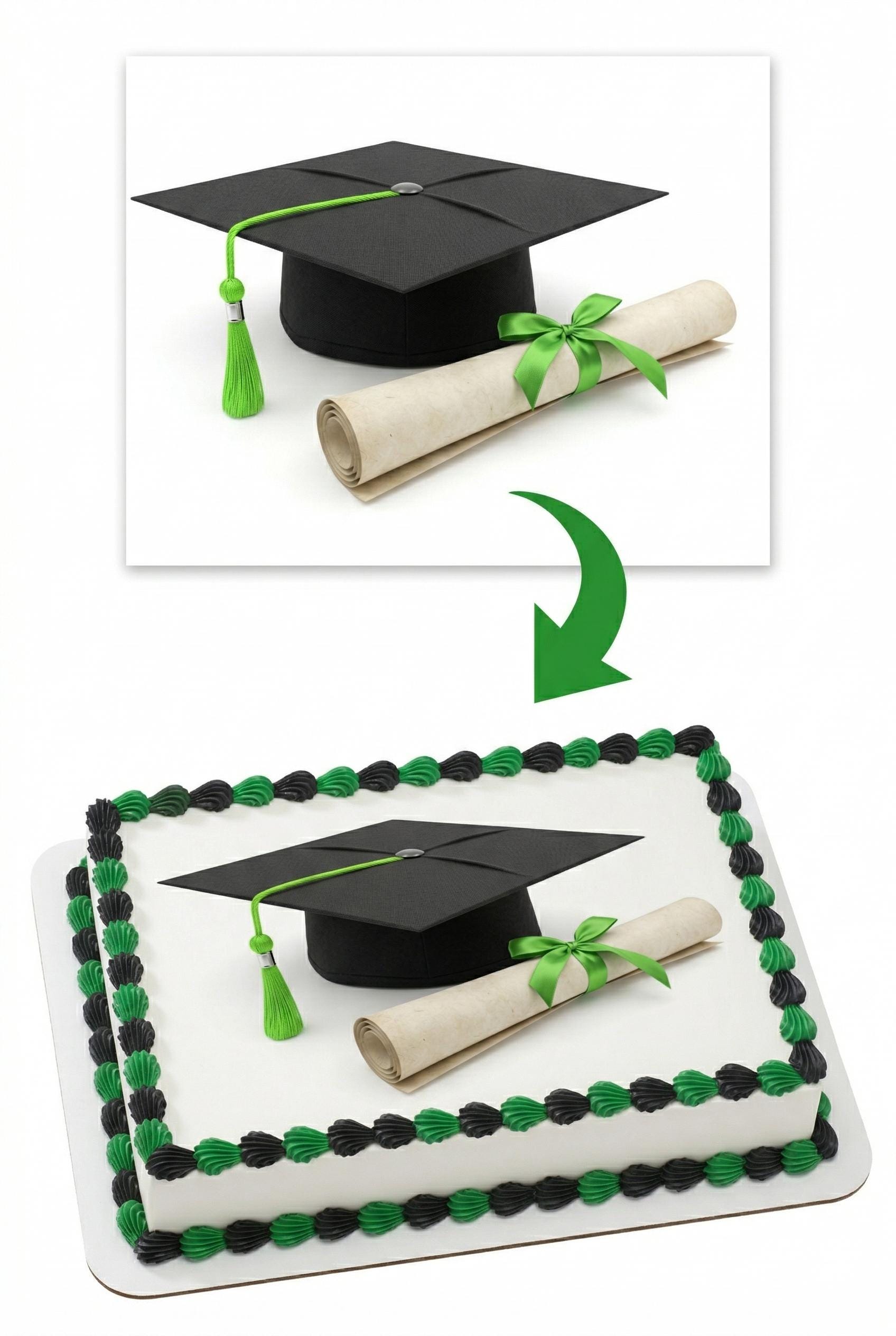 Graduation Cap and Diploma with Green Tassel Edible Cake Topper — a classic commencement design perfect for graduation parties, open houses, and celebration desserts! Features a black mortarboard cap with bright green tassel alongside a rolled diploma tied with a green satin ribbon, printed in vivid detail on a premium frosting sheet. Available in 9 size options to fit any cake, cupcake, or dessert.