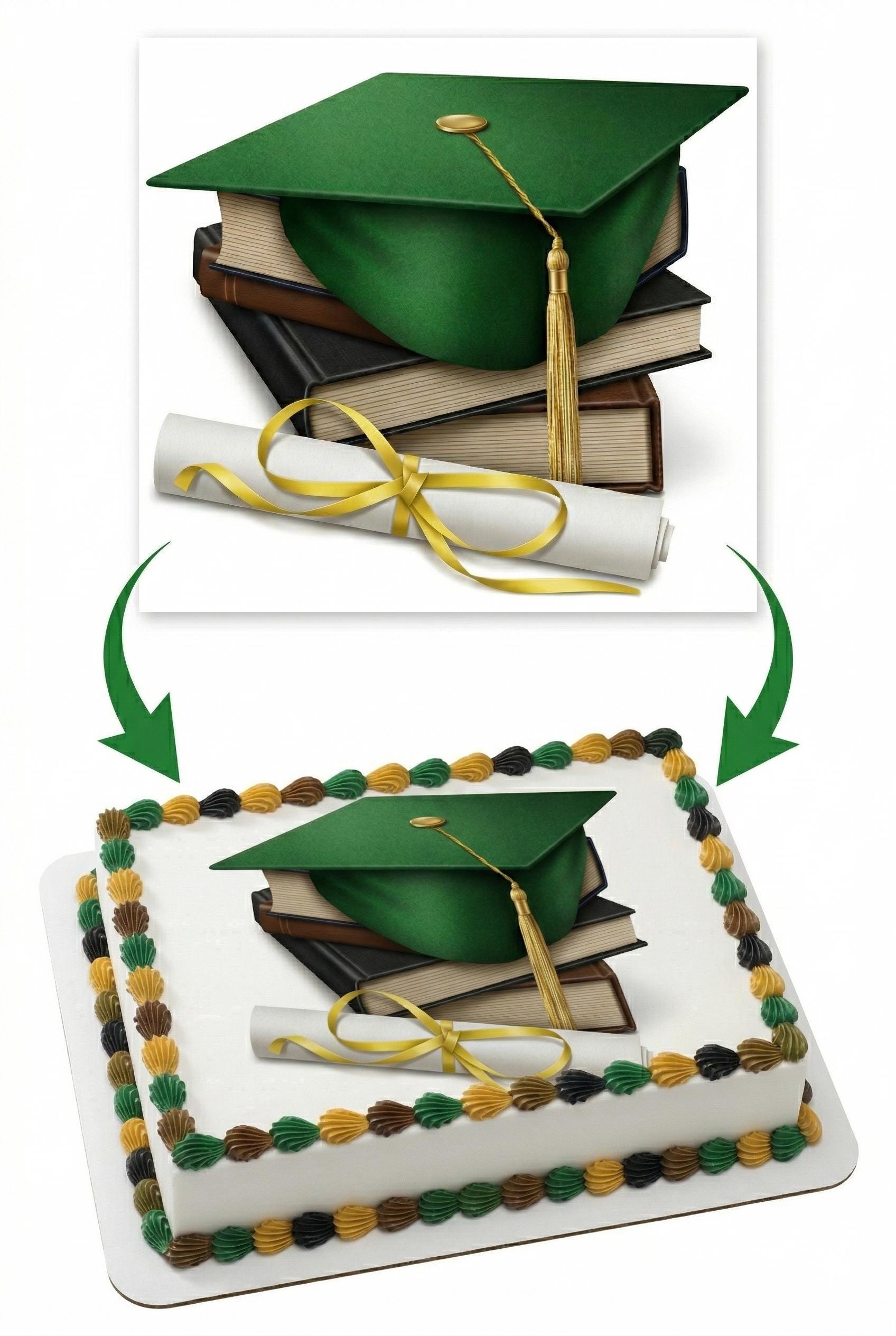 Green Graduation Cap with Books and Diploma Edible Cake Topper — a scholarly commencement design perfect for graduation parties, open houses, and academic celebrations! Features a green mortarboard cap with gold tassel resting on a stack of books alongside a rolled diploma tied with a gold ribbon, printed in vivid detail on a premium frosting sheet. Available in 9 size options to fit any cake, cupcake, or dessert.