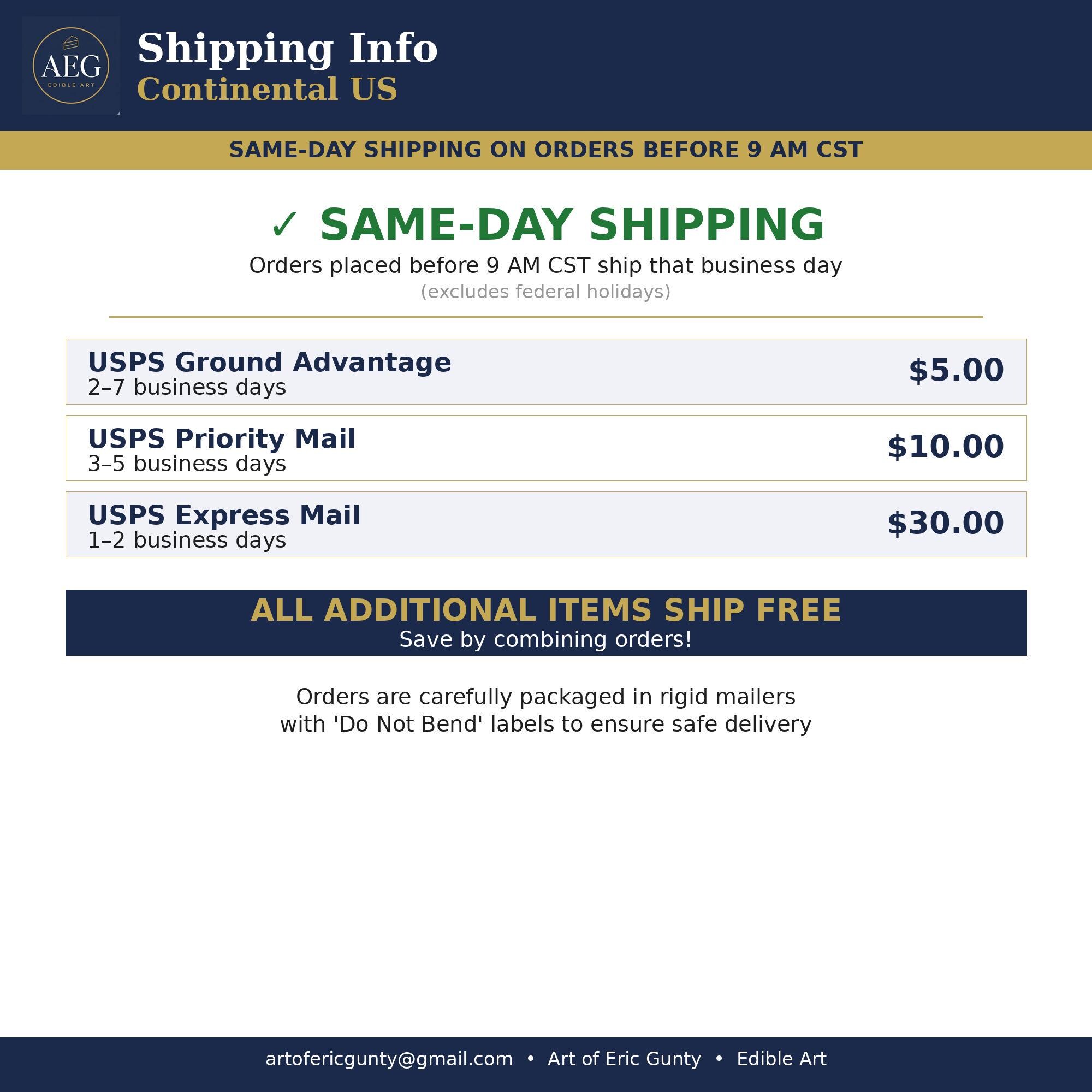 ‣ USPS Priority (3–5 business days) — $10.00