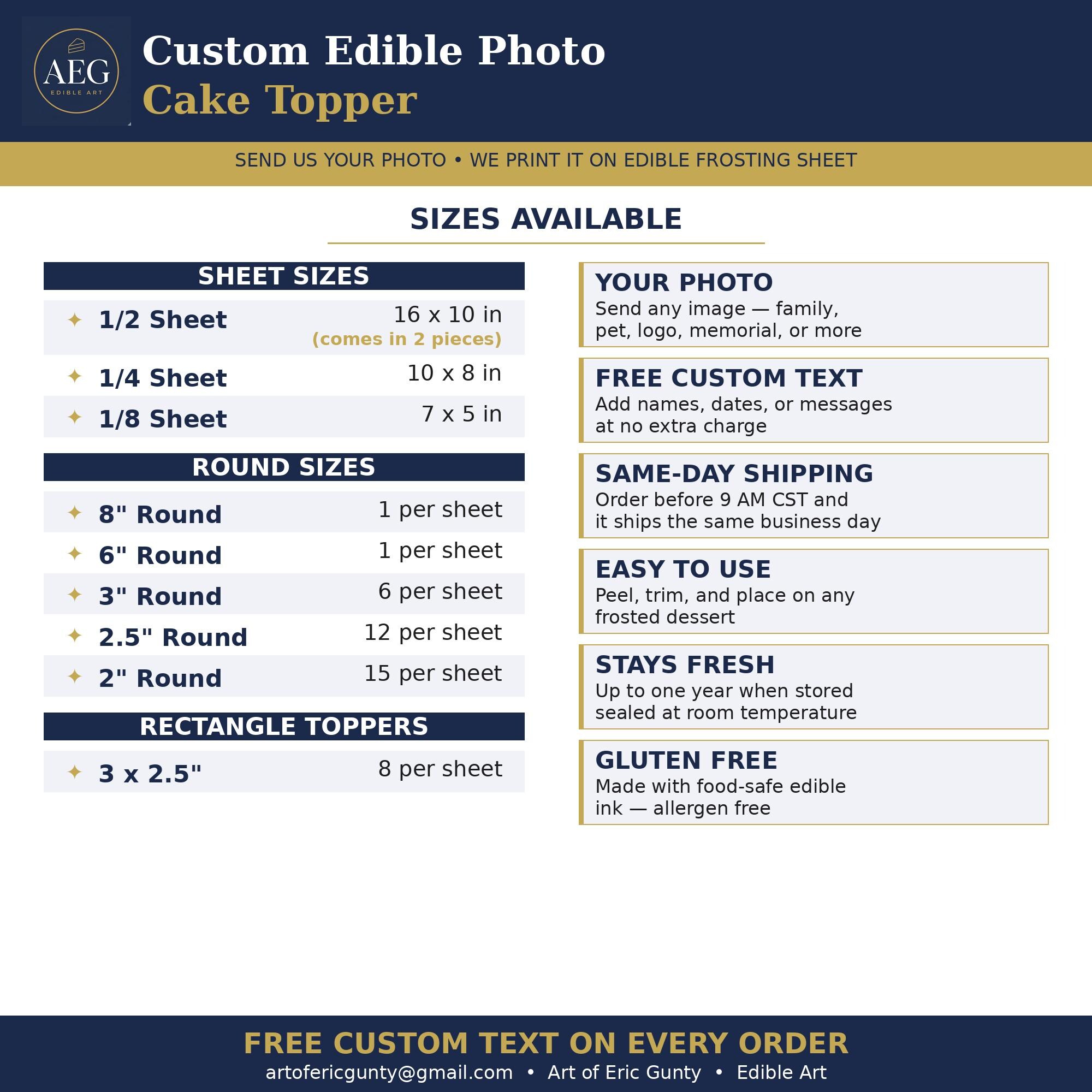 Custom Edible Cake Topper — Personalized Photo Image Printed on Premium Frosting Sheet for Cakes, Cupcakes, Cookies & Desserts. Free Custom Text on Any Design!