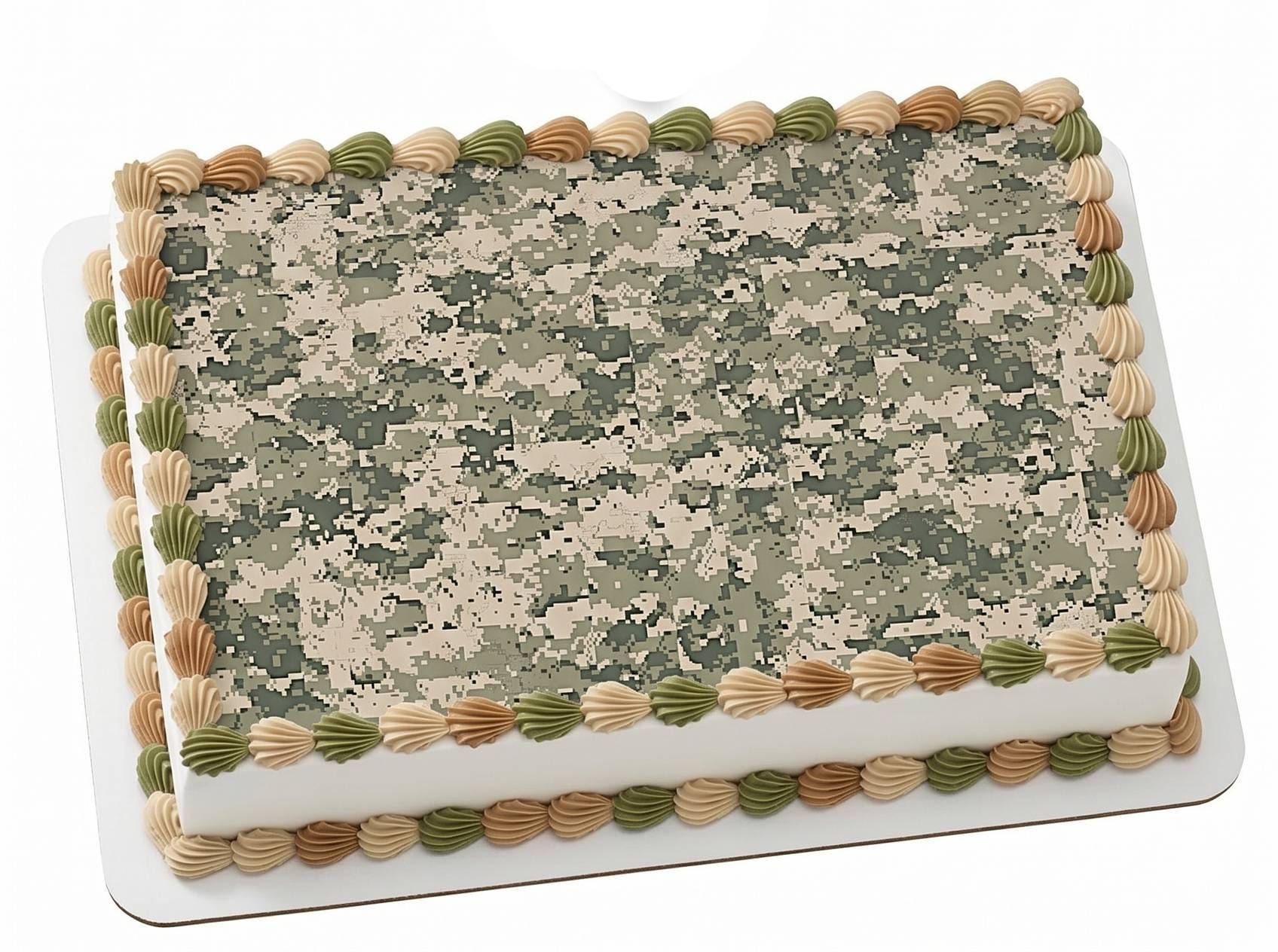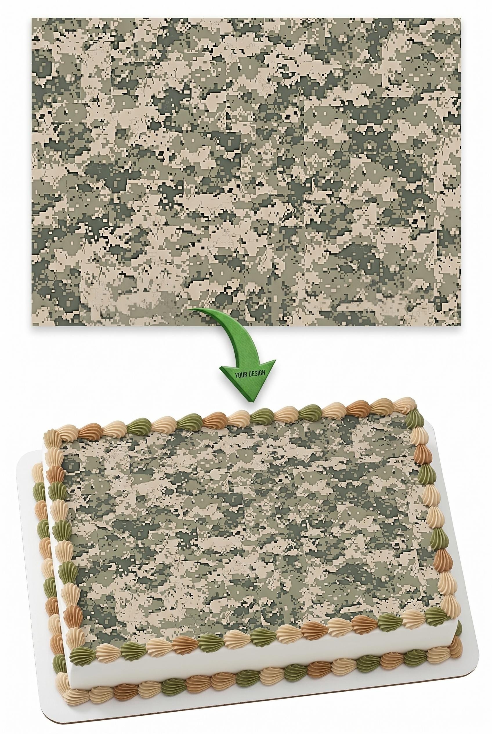 Our edible cake toppers arrive printed exactly as pictured on a premium fondant frosting sheet (cake not included). A bold full-coverage ACU digital camouflage pattern in sage green, tan, and gray covers the entire top of your cake — perfect for military celebrations, Army homecomings, hunting themed parties, and anyone who loves the rugged look of digital camo. Simply trim to size, peel from the backing, and place on your frosted cake for a stunning, professional finish. Made to order with vibrant, food-safe edible ink on a high-quality icing sheet that blends seamlessly into buttercream, fondant, royal icing, or whipped frosting.