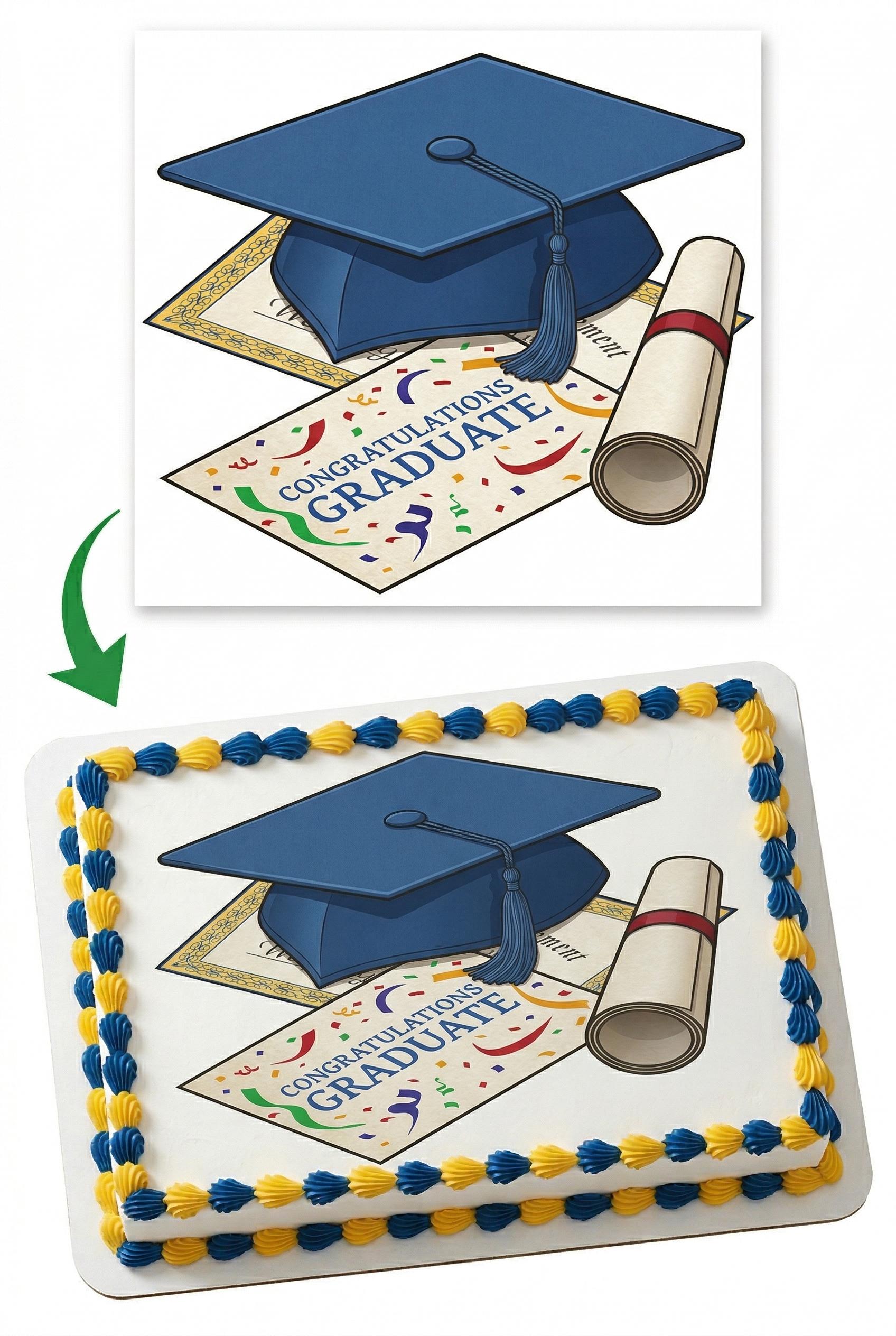 Your edible blue cap Congratulations Graduate cake topper arrives printed exactly as pictured on a premium fondant frosting sheet (cake not included). Featuring a bright blue mortarboard cap, diploma details, and festive confetti accents — this cheerful graduation design adds a polished and celebratory touch to any dessert while honoring your graduate’s big accomplishment in style. Simply peel, trim, and place on any frosted dessert — it's that easy. Each edible image is made to order and printed with vibrant, food-safe edible ink on a high-quality icing sheet that blends seamlessly into buttercream, fondant, royal icing, or whipped frosting.