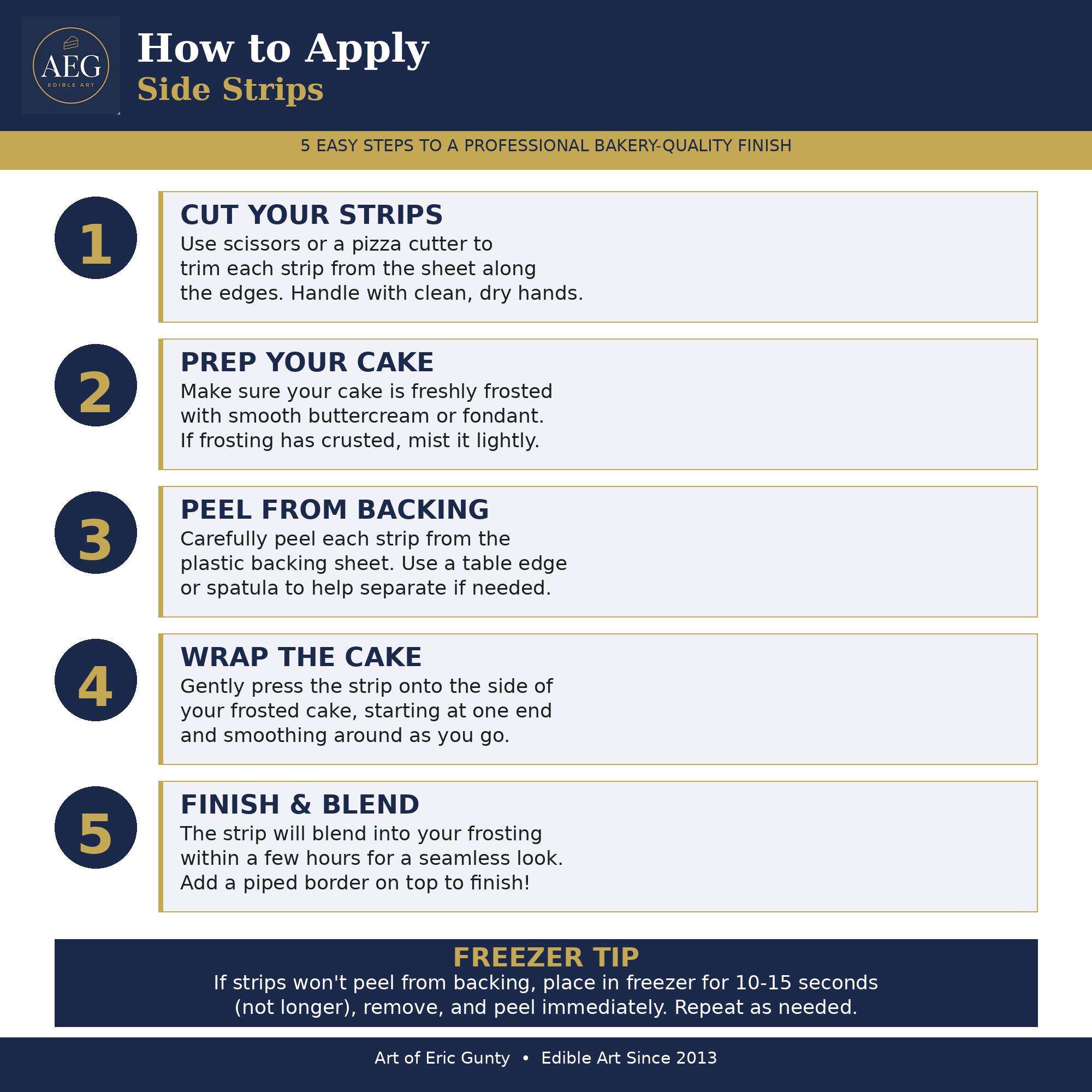 Trim each strip from the sheet using scissors or a pizza cutter. Peel from the backing and gently press onto a freshly frosted cake, working around the sides. For best results, apply to a smooth layer of buttercream or fondant icing. The edible strip will blend into your frosting within hours for a finished, bakery-quality cake wrap.
