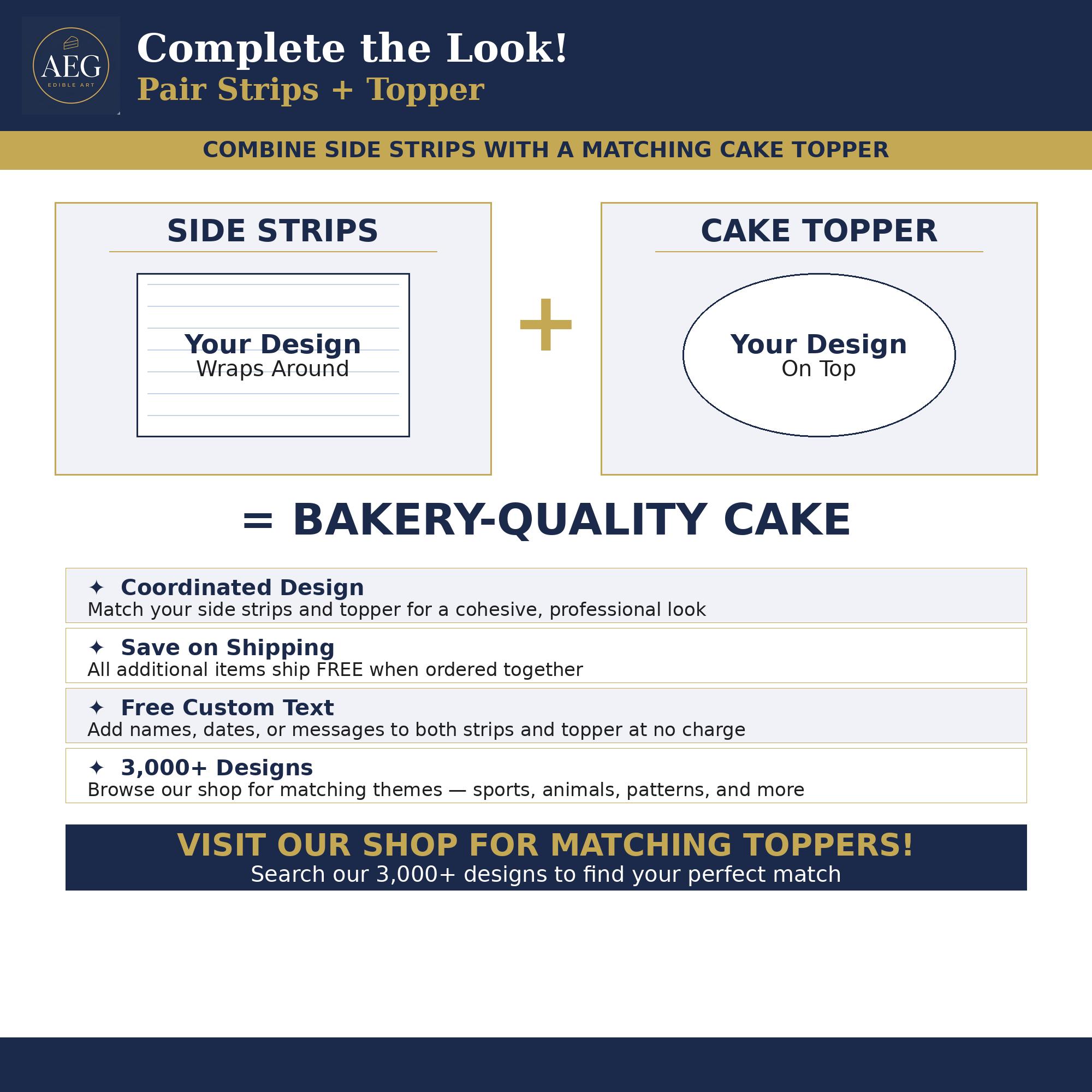 Combine our edible side strips with a matching edible cake topper for a complete, coordinated design. Save on shipping by ordering both at the same time — all additional items ship free!