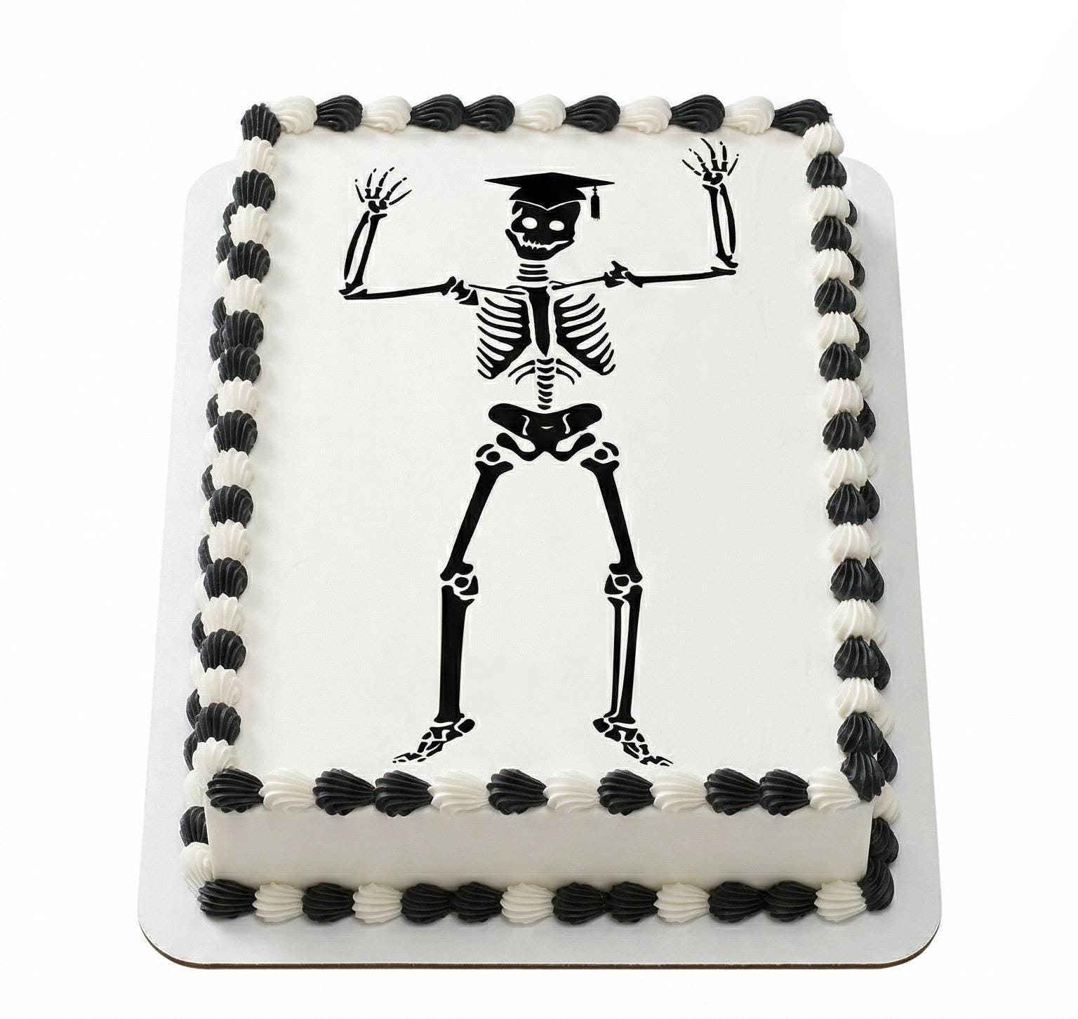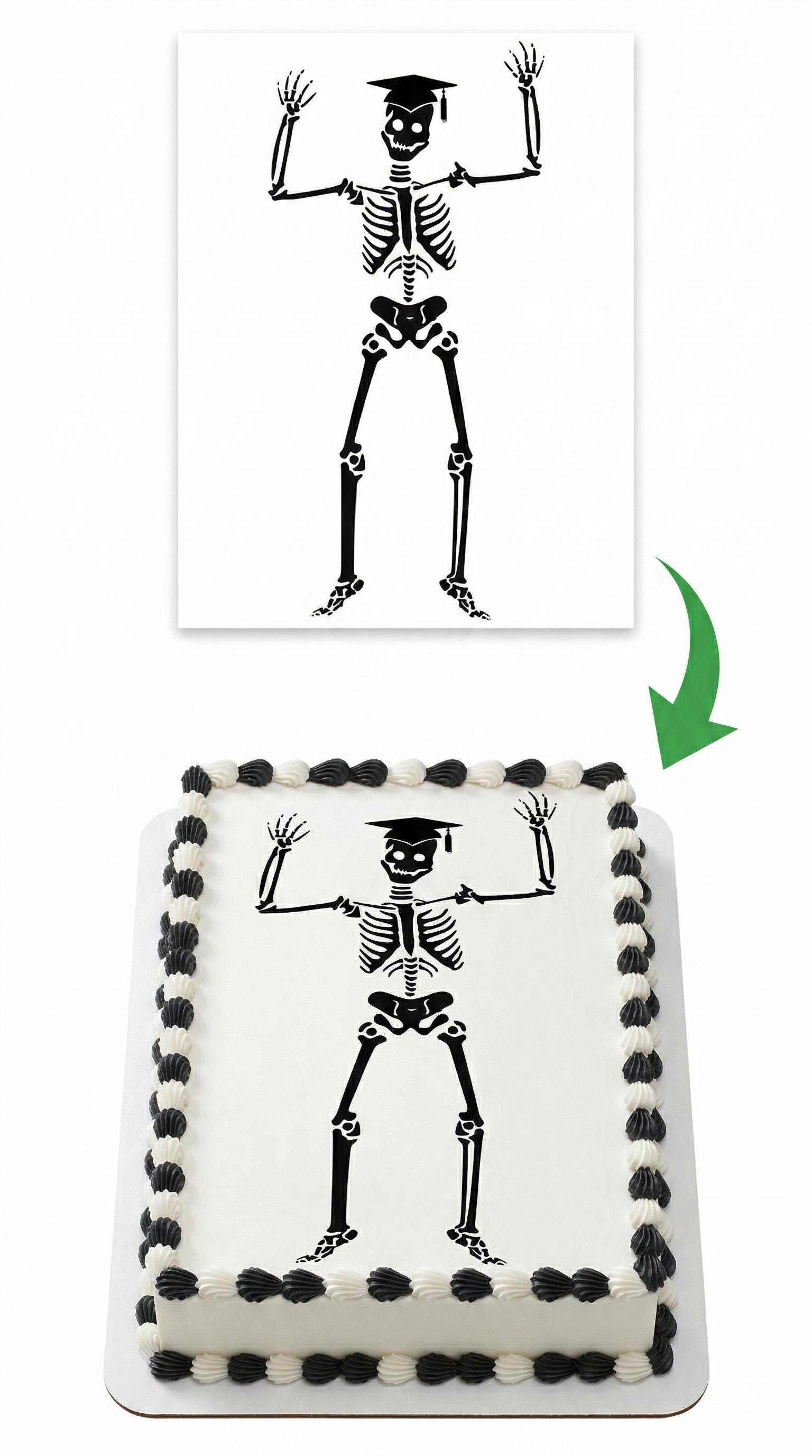 Graduation Skeleton with Cap Edible Cake Topper — a funny and unique graduation design perfect for commencement parties, open houses, and celebration desserts! Features a dancing skeleton wearing a graduation cap with hands raised in celebration, printed in bold black silhouette on a premium frosting sheet. A hilarious choice for nursing, medical, or anatomy grads. Available in 9 size options to fit any cake, cupcake, or dessert.