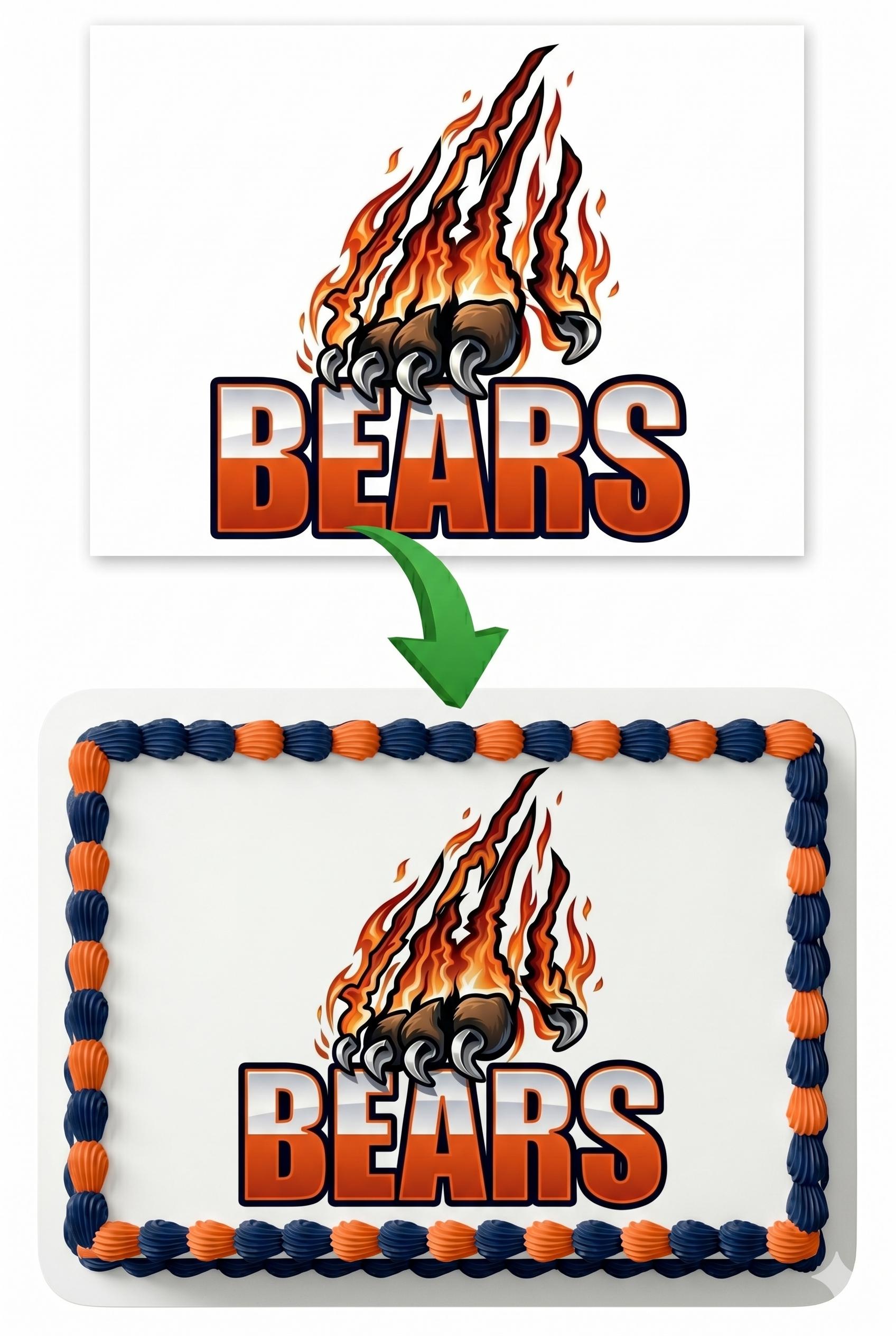 Bears Mascot Edible Cake Topper — Bold Orange and Navy Bears Flaming Claw Sports Logo Frosting Sheet Image Printed on Premium Fondant Sheet. Free Custom Text!