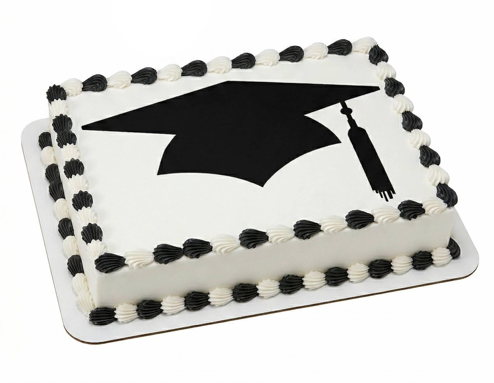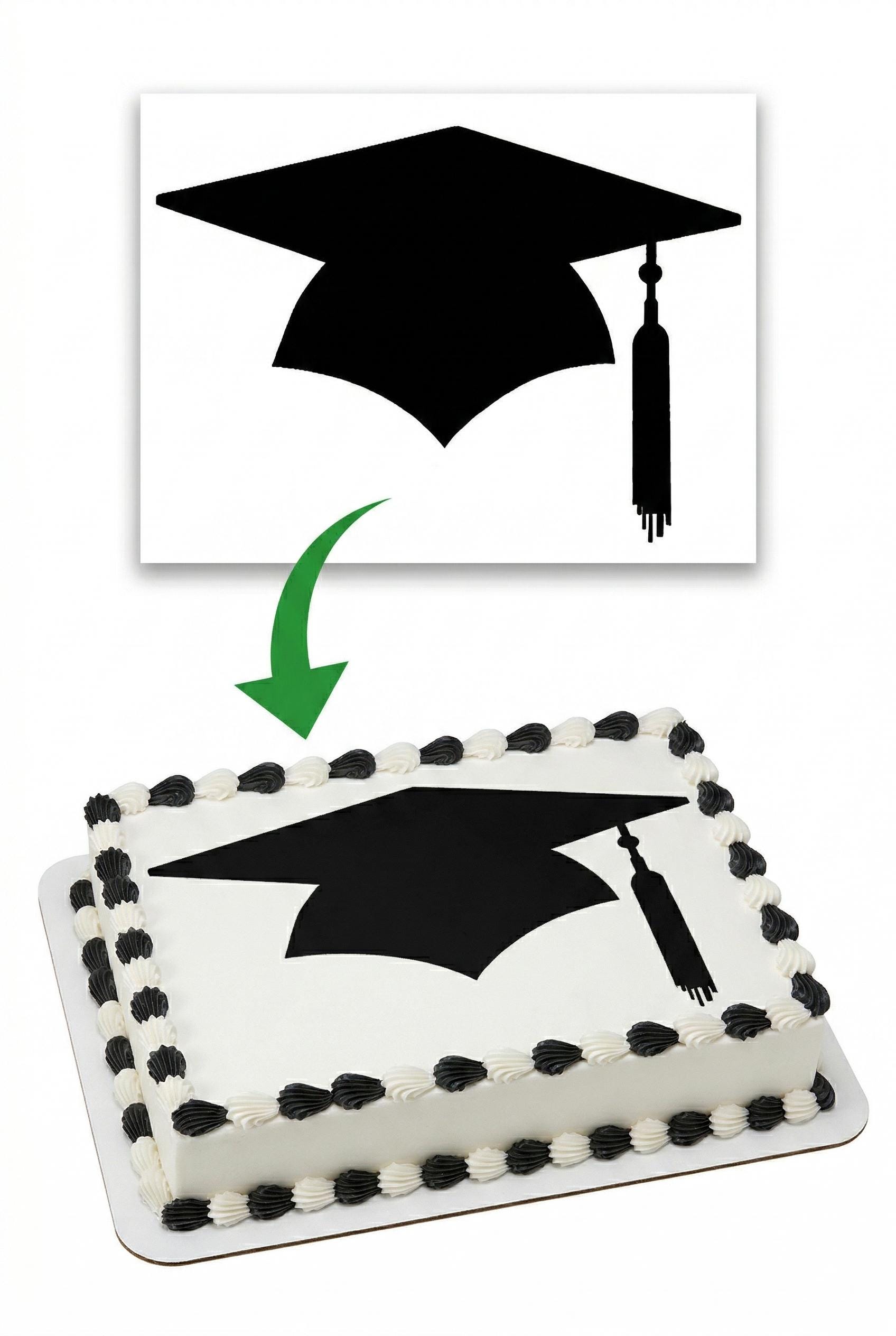 Black Graduation Cap Silhouette with Tassel Edible Cake Topper — a classic and bold commencement design perfect for graduation parties, open houses, and celebration desserts! Features a striking black mortarboard cap silhouette with tassel, printed in clean detail on a premium frosting sheet. A timeless design that works with any school colors and complements any frosting combination. Available in 9 size options to fit any cake, cupcake, or dessert.