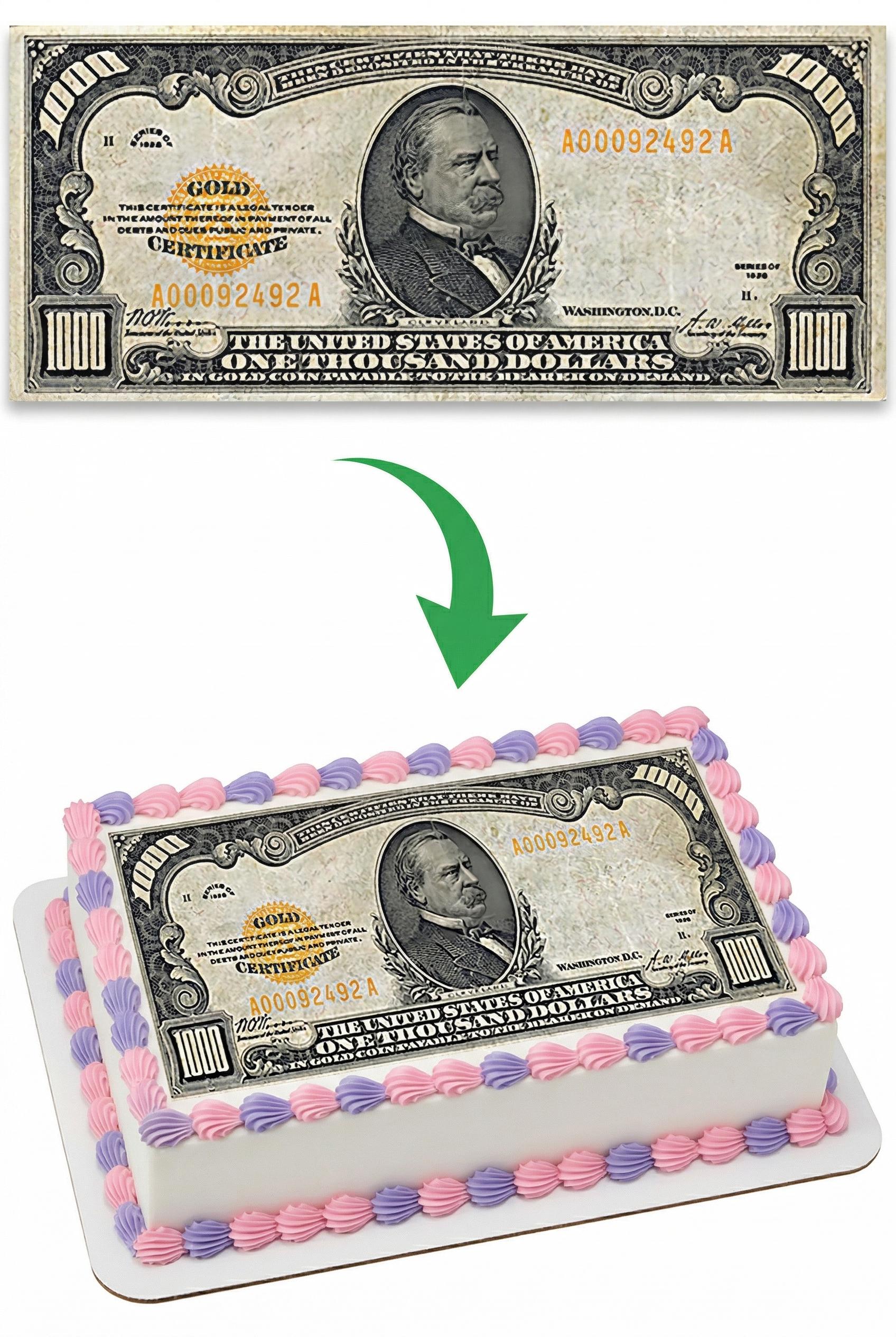 1000 Dollar Gold Certificate Bill Edible Cake Topper — Vintage US Gold Certificate Printed on Premium Frosting Sheet for Cakes, Cupcakes & Cookies. Perfect for Money Lovers. Free Custom Text!