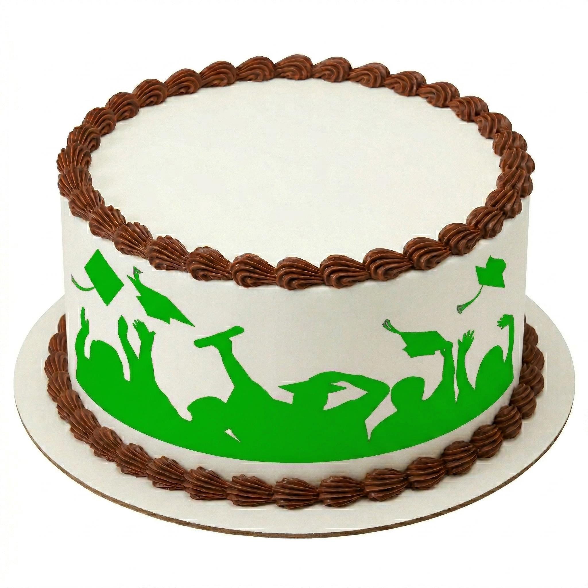 Green Graduation Cap Toss Silhouette Edible Cake Side Strip — a festive graduation design perfect for wrapping around any commencement cake! Features celebrating graduates tossing their caps into the air in a bold green silhouette on a clean white background, printed in vibrant detail on a premium frosting sheet. Pairs perfectly with school-colored frosting for any grad celebration. Available in 9 size options to fit any cake.