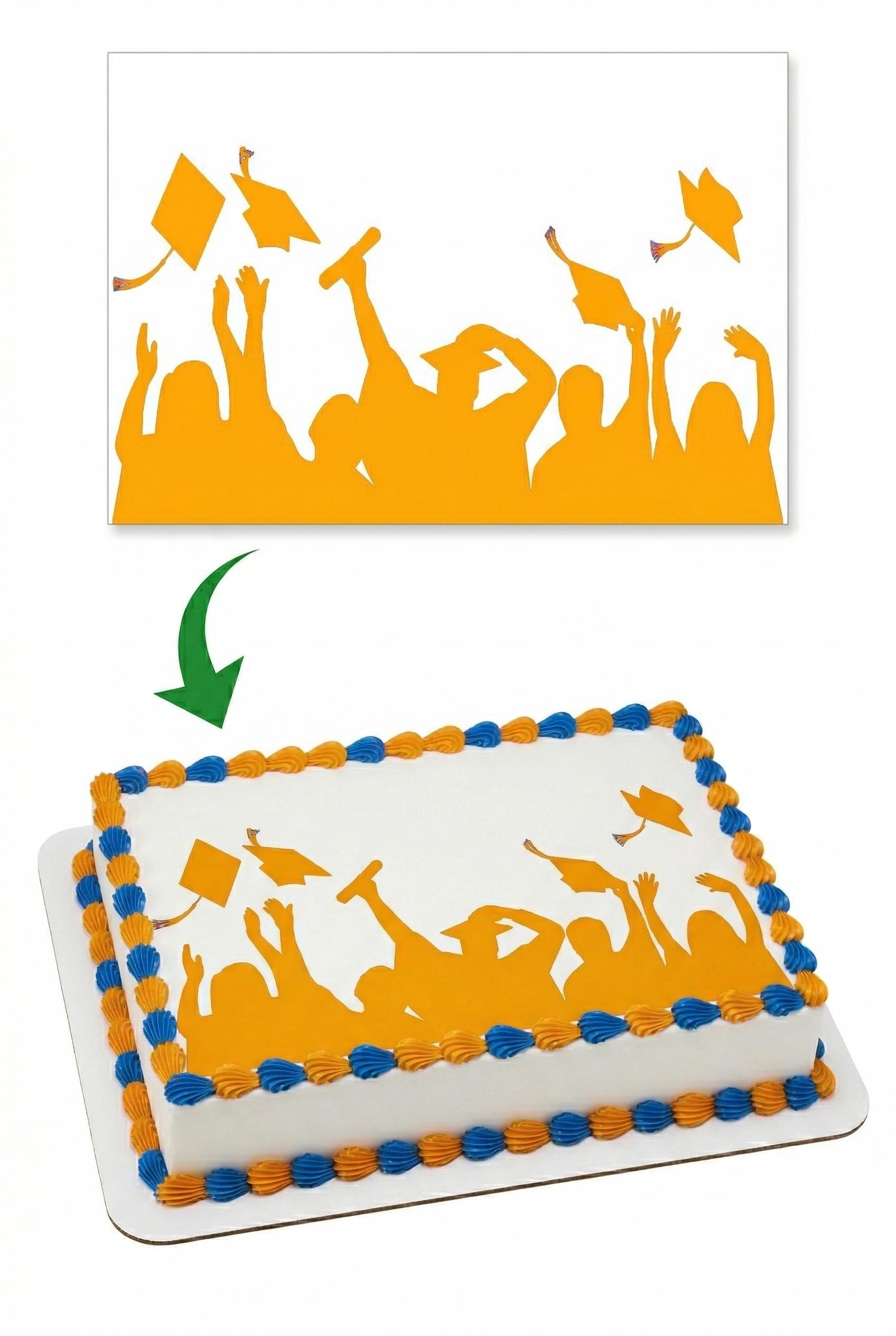 Orange Graduation Silhouette Cap Toss Edible Cake Topper — a festive commencement design perfect for graduation parties, open houses, and celebration desserts! Features a crowd of excited graduates tossing their caps into the air in a bold orange silhouette, printed in vivid detail on a premium frosting sheet. Pairs perfectly with school-colored frosting and decorations. Available in 9 size options to fit any cake, cupcake, or dessert.