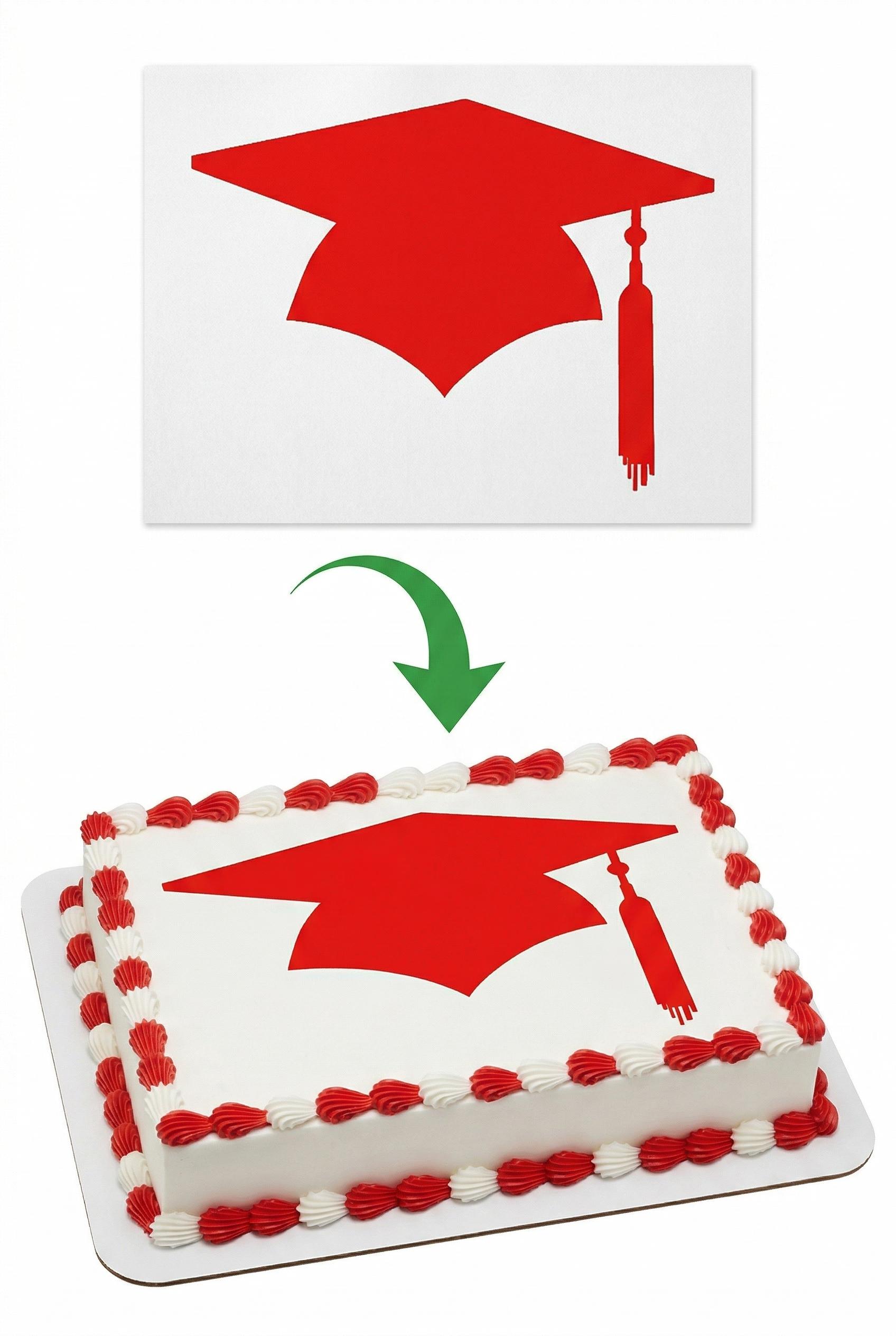 Red Graduation Cap Silhouette with Tassel Edible Cake Topper — a bold and simple commencement design perfect for graduation parties, open houses, and celebration desserts! Features a striking red mortarboard cap silhouette with tassel, printed in clean detail on a premium frosting sheet. Pairs perfectly with school-colored frosting and decorations for any grad celebration. Available in 9 size options to fit any cake, cupcake, or dessert.