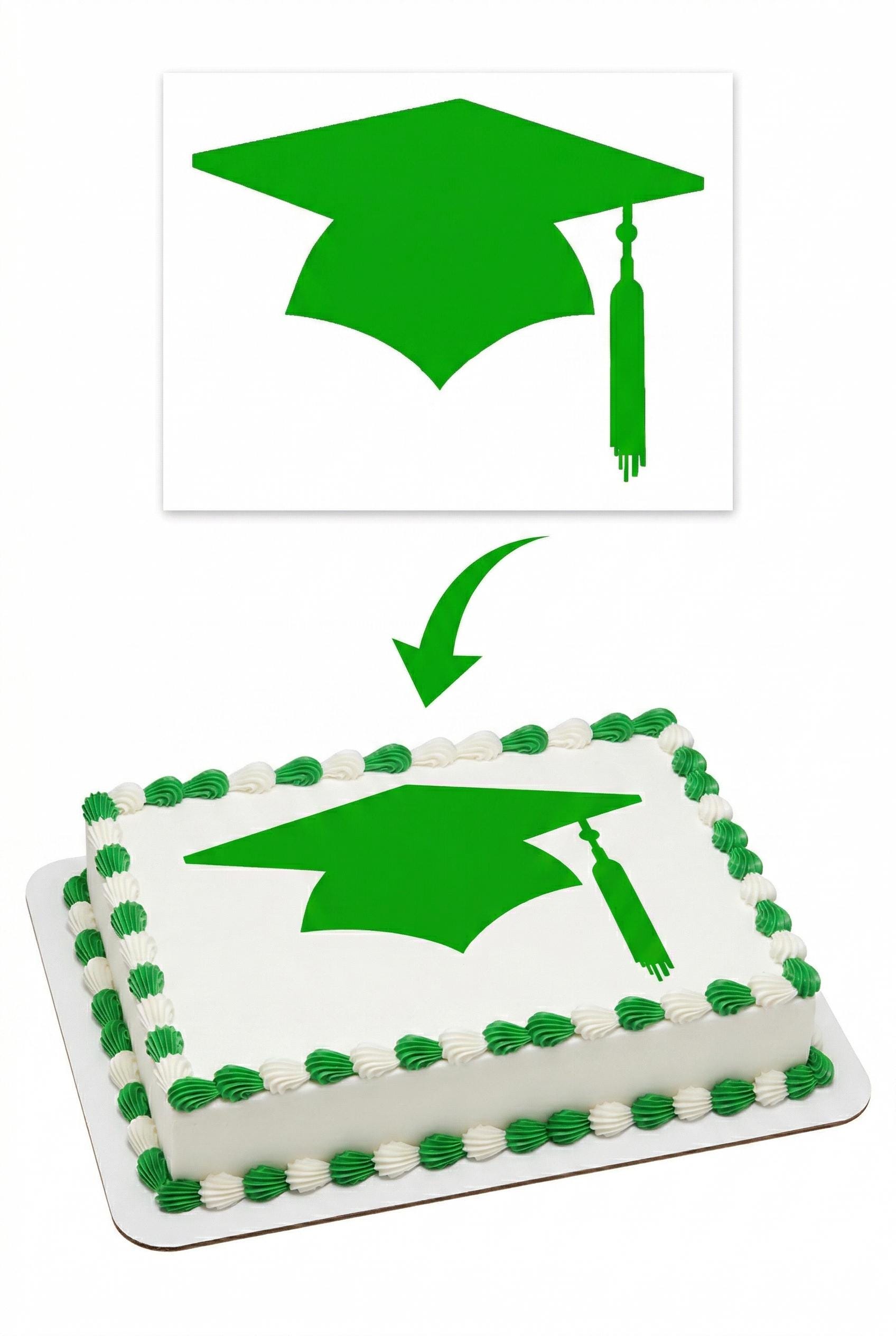 Green Graduation Cap Silhouette with Tassel Edible Cake Topper — a bold and simple commencement design perfect for graduation parties, open houses, and celebration desserts! Features a striking green mortarboard cap silhouette with tassel, printed in clean detail on a premium frosting sheet. Pairs perfectly with school-colored frosting and decorations for any grad celebration. Available in 9 size options to fit any cake, cupcake, or dessert.