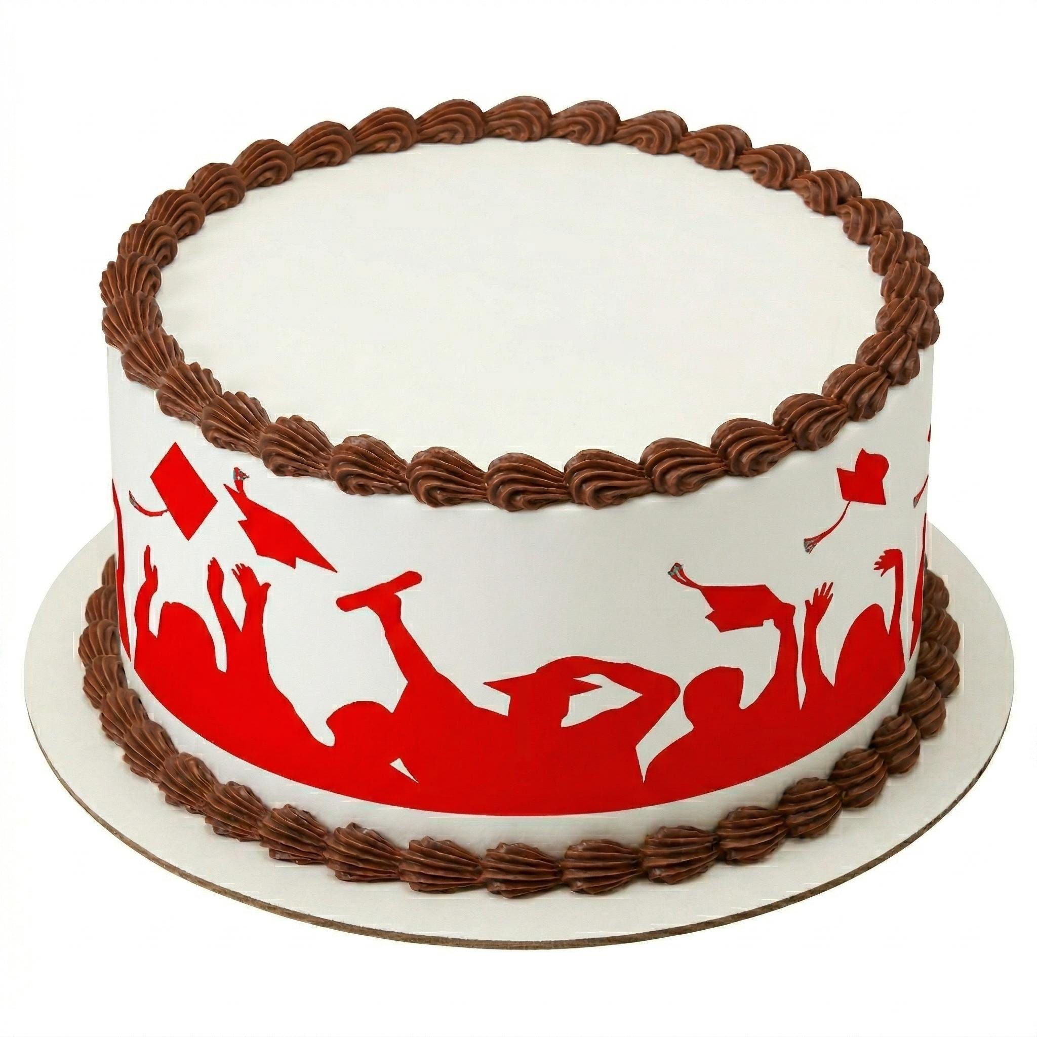 Red Graduation Cap Toss Silhouette Edible Cake Side Strip — a festive graduation design perfect for wrapping around any commencement cake! Features celebrating graduates tossing their caps into the air in a bold red silhouette on a clean white background, printed in vibrant detail on a premium frosting sheet. Pairs perfectly with school-colored frosting for any grad celebration. Available in 9 size options to fit any cake.
