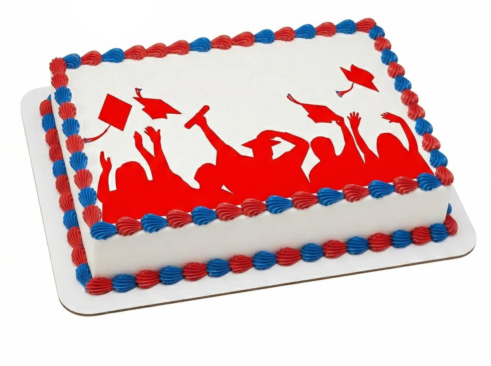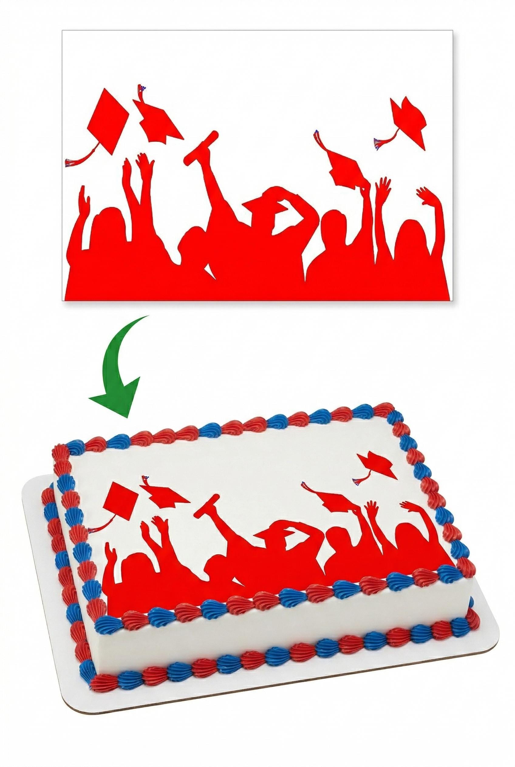 Red Graduation Silhouette Cap Toss Edible Cake Topper — a festive commencement design perfect for graduation parties, open houses, and celebration desserts! Features a crowd of excited graduates tossing their caps into the air in a bold red silhouette, printed in vivid detail on a premium frosting sheet. Pairs perfectly with school-colored frosting and decorations. Available in 9 size options to fit any cake, cupcake, or dessert.