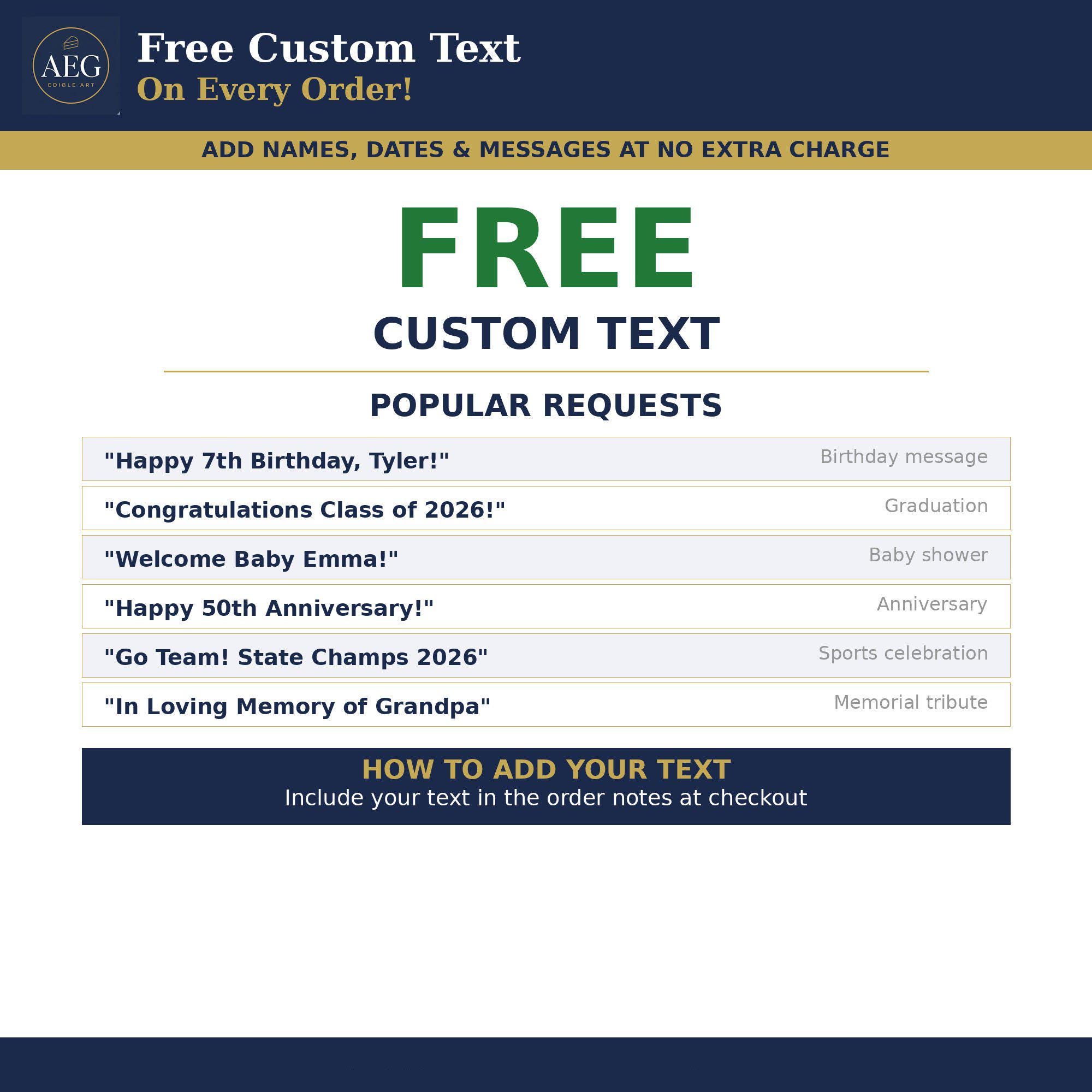 Send your own photo, logo, or image using the "Attach Image" button in Etsy messages, or email it to artofericgunty [!at] gmail.com. We'll print it as personalized edible cake side strips just for you.
